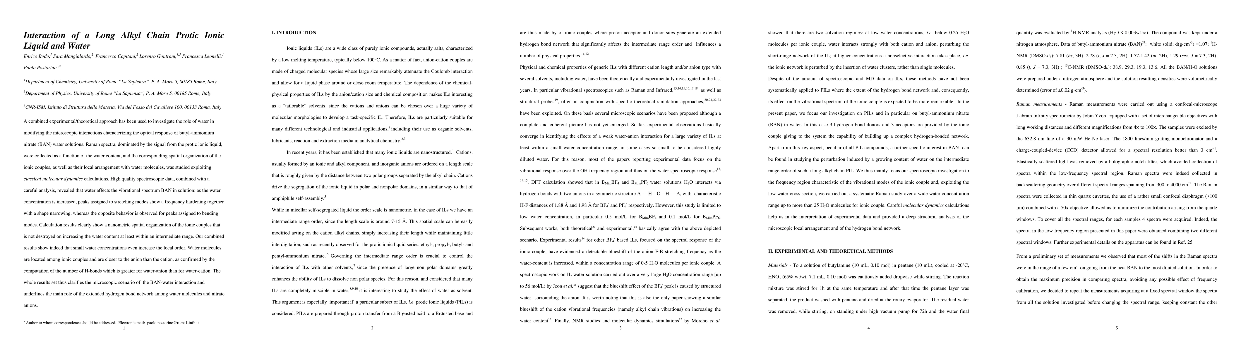 This study combines experimental Raman spectroscopy and theoretical molecular dynamics to explore how water influences the optical response of butyl-ammonium nitrate (BAN) solutions. Results show that increasing water concentration enhances local order and modifies the vibrational spectrum, with peaks for stretching modes hardening and narrowing, while bending modes soften.