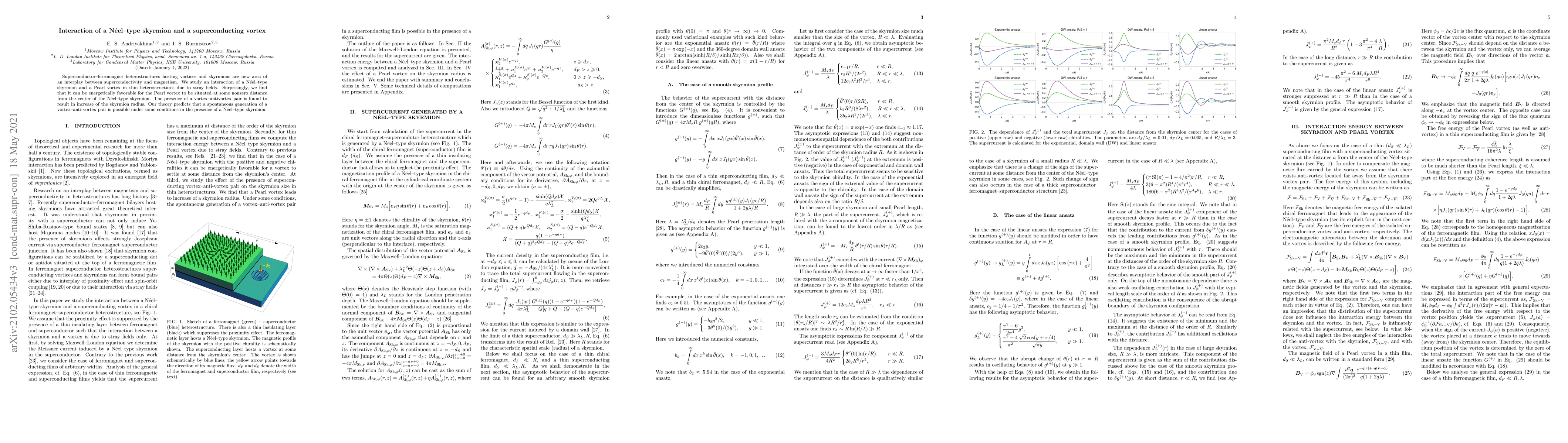 Superconductor-ferromagnet heterostructures hosting vortices and skyrmions are new area of an interplay between superconductivity and magnetism. We study an interaction of a Neel-type skyrmion and a Pearl vortex in thin heterostructures due to stray fields. Surprisingly, we find that it can be energetically favorable for the Pearl vortex to be situated at some nonzero distance from the center of the Neel-type skyrmion. The presence of a vortex-antivortex pair is found to result in increase of the skyrmion radius. Our theory predicts that a spontaneous generation of a vortex-anti-vortex pair is possible under some conditions in the presence of a Neel-type skyrmion.
