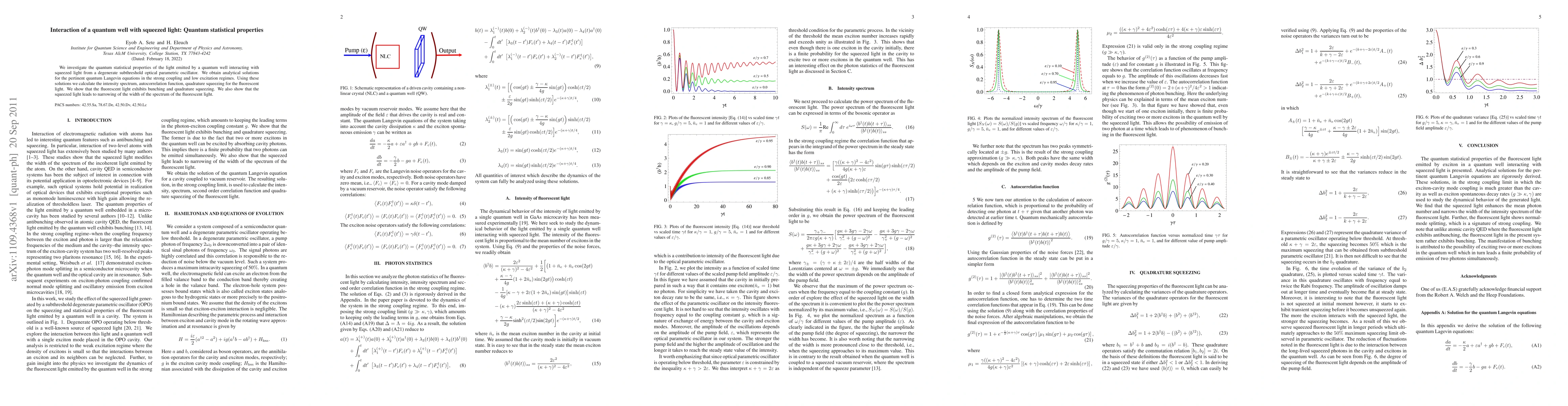 Researchers investigated quantum well interactions with squeezed light, finding that fluorescent light exhibits bunching and quadrature squeezing, and is narrowed in width due to the presence of squeezed light.