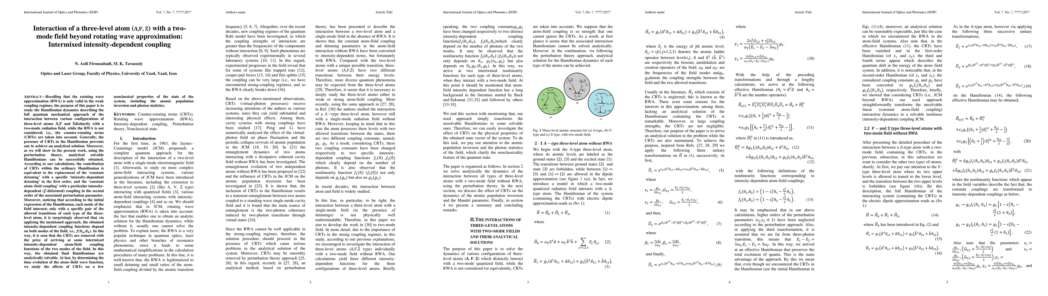 This paper investigates the quantum mechanical interaction between three-level atoms (Lambda, V, and ladder configurations) and a two-mode field beyond the rotating wave approximation, focusing on counter-rotating terms. It employs perturbation theory to derive analytically solvable Hamiltonians, revealing intermixed intensity-dependent coupling functions and studying the effects on nonclassical properties like atomic population inversion and photon statistics.