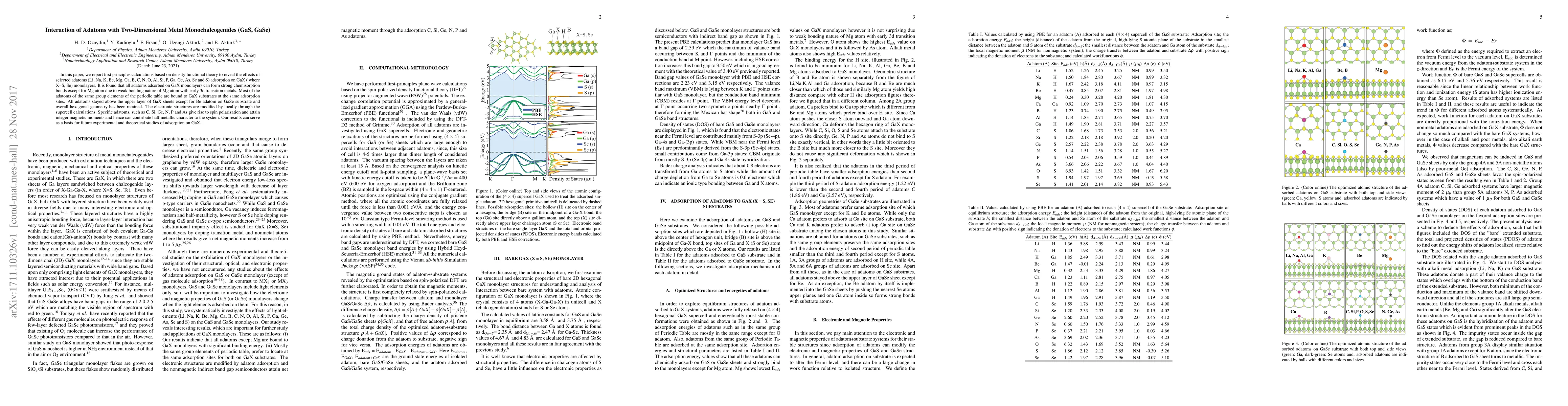In this paper, we report first principles calculations based on density functional theory to reveal the effects of selected adatoms (Li, Na, K, Be, Mg, Ca, B, C, N, O, Al, Si, P, Ga, Ge, As, Se and S) adsorption on GaX ( where X=S, Se) monolayers. It is found that all adatoms adsorbed on GaX monolayers can form strong chemisorption bonds except for Mg atom due to weak bonding nature of Mg atom with early 3d transition metals. Most of the adatoms of the same group elements of the periodic table are bound to GaX substrates at the same adsorption sites. All adatoms stayed above the upper layer of GaX sheets except for Be adatom on GaSe substrate and overall hexagonal geometry has been retained. The electronic structures are modified by locally through the supercell calculations. Specific adatoms, such as C, Si, Ge, N, P and As give rise to spin polarization and attain integer magnetic moments and hence can contribute half metallic character to the system. Our results can serve as a basis for future experimental and theoretical studies of adsorption on GaX.