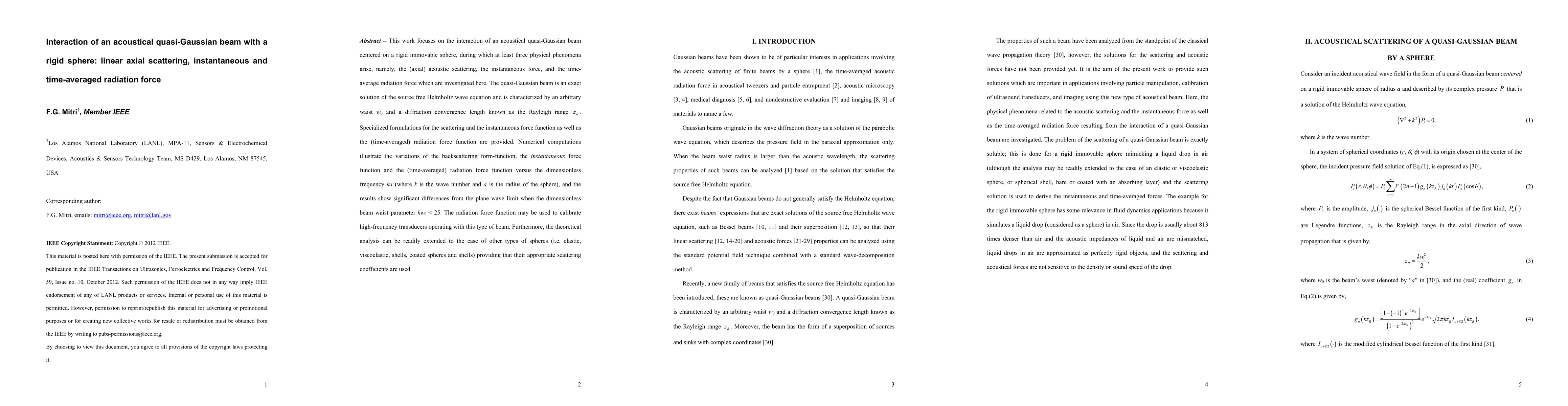 This paper investigates the interaction of an acoustical quasi-Gaussian beam with a rigid sphere, focusing on axial scattering, instantaneous force, and time-averaged radiation force. Numerical results show significant differences from plane wave interactions, especially when the beam waist parameter is small, and the findings can be extended to other sphere types.