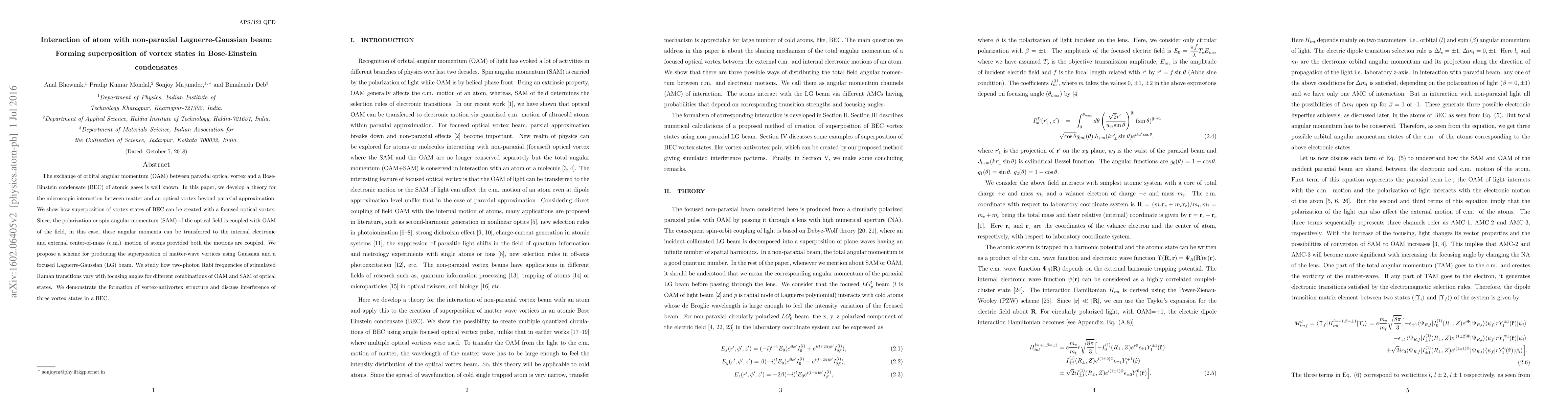 The exchange of orbital angular momentum (OAM) between paraxial optical vortex and a Bose-Einstein condensate (BEC) of atomic gases is well known. In this paper, we develop a theory for the microscopic interaction between matter and an optical vortex beyond paraxial approximation. We show how superposition of vortex states of BEC can be created with a focused optical vortex. Since, the polarization or spin angular momentum (SAM) of the optical field is coupled with OAM of the field, in this case, these angular momenta can be transferred to the internal electronic and external center-of-mass (c.m.) motion of atoms provided both the motions are coupled. We propose a scheme for producing the superposition of matter-wave vortices using Gaussian and a focused Laguerre-Gaussian (LG) beam. We study how two-photon Rabi frequencies of stimulated Raman transitions vary with focusing angles for different combinations of OAM and SAM of optical states. We demonstrate the formation of vortex-antivortex structure and discuss interference of three vortex states in a BEC.