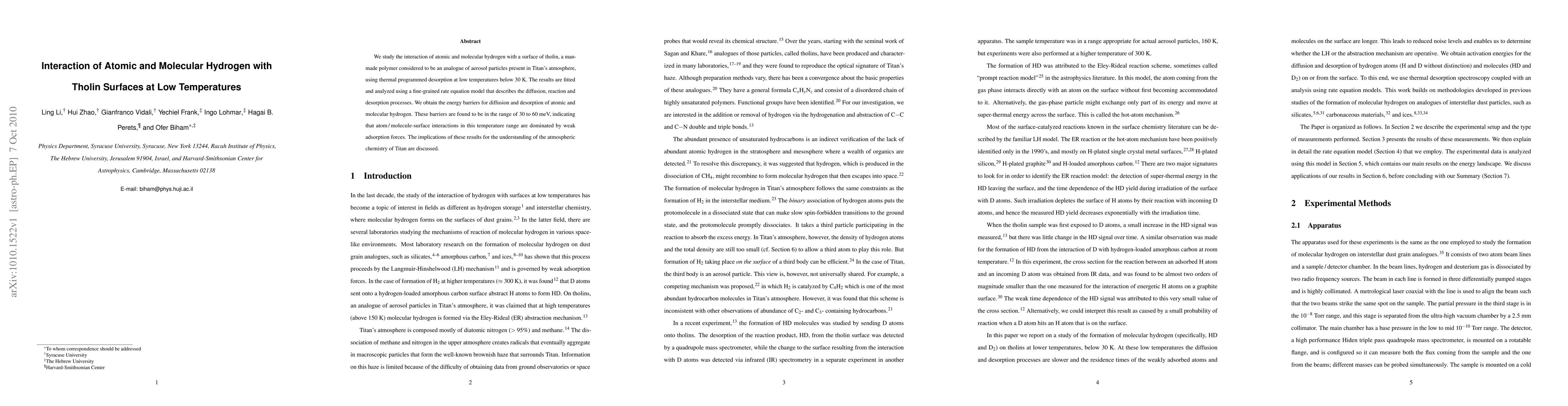 This study investigates the interaction of atomic and molecular hydrogen with tholin surfaces at low temperatures, revealing energy barriers of 30 to 60 meV for diffusion and desorption, indicating weak adsorption forces. The findings enhance our understanding of Titan's atmospheric chemistry.