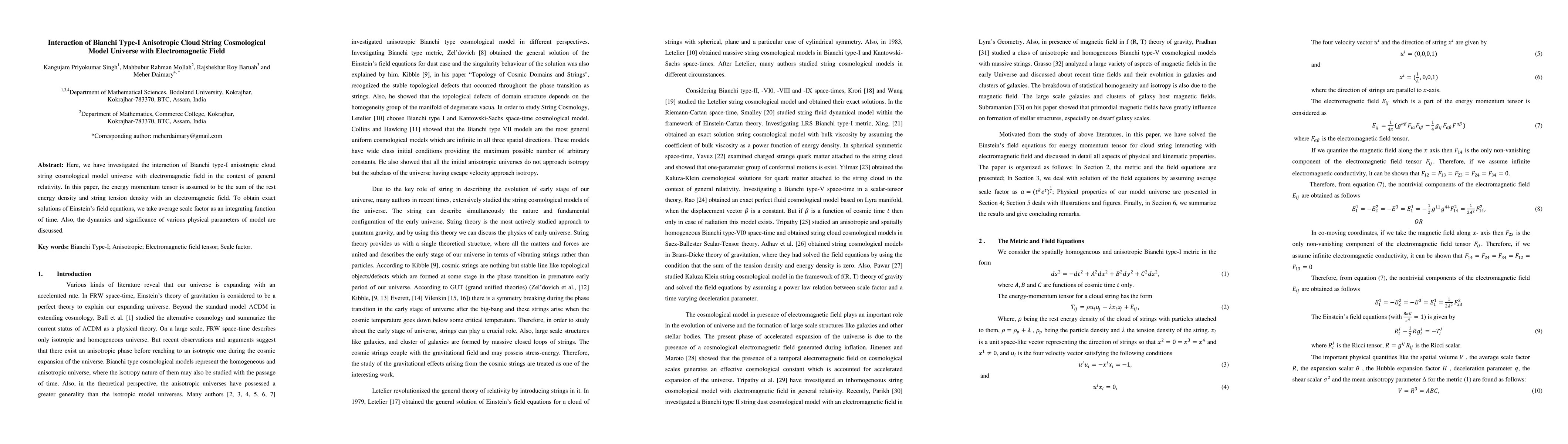 This paper explores the interaction between a Bianchi type I anisotropic cloud string cosmological model and an electromagnetic field within the framework of general relativity. Exact solutions of the Einstein field equations are derived using an average scale factor, and the dynamics and physical significance of various parameters are analyzed.