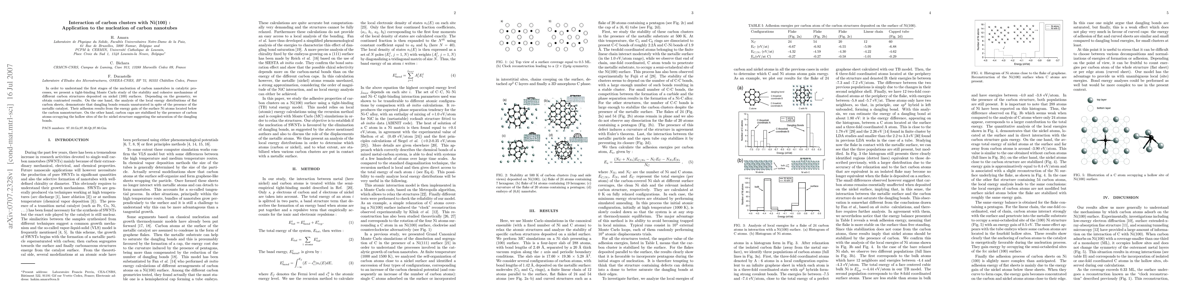 In order to understand the first stages of the nucleation of carbon nanotubes in catalytic processes, we present a tight-binding Monte Carlo study of the stability and cohesive mechanisms of different carbon structures deposited on nickel (100) surfaces. Depending on the geometry, we obtain contrasted results. On the one hand, the analysis of the local energy distributions of flat carbon sheets, demonstrate that dangling bonds remain unsaturated in spite of the presence of the metallic catalyst. Their adhesion results from the energy gain of the surface Ni atoms located below the carbon nanostructure. On the other hand, carbon caps are stabilized by the presence of carbon atoms occupying the hollow sites of the fcc nickel structure suggesting the saturation of the dangling bonds.