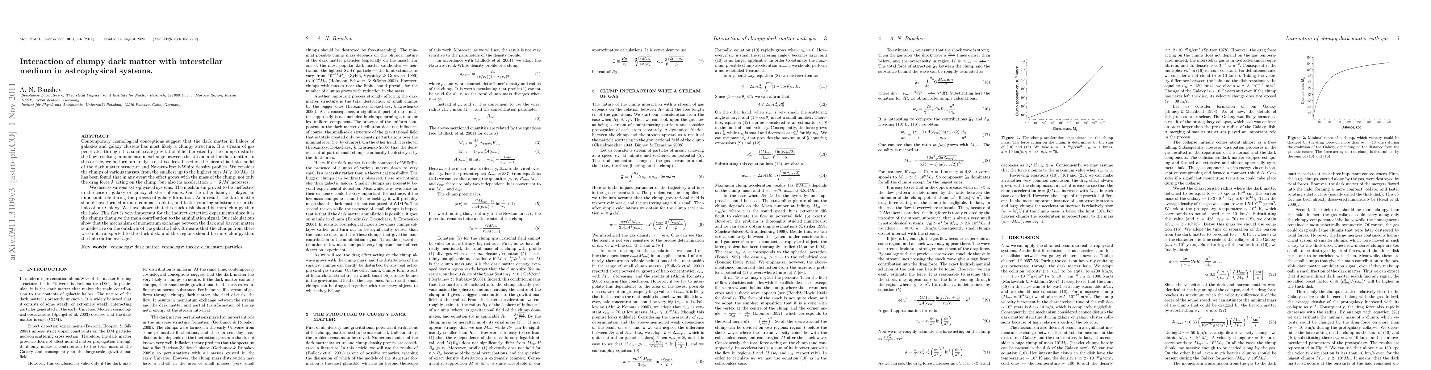 Contemporary cosmological conceptions suggest that the dark matter in haloes of galaxies and galaxy clusters has most likely a clumpy structure. If a stream of gas penetrates through it, a small-scale gravitational field created by the clumps disturbs the flow resulting in momentum exchange between the stream and the dark matter. In this article, we perform an analysis of this effect, based on the hierarchial halo model of the dark matter structure and Navarro-Frenk-White density profiles. We consider the clumps of various masses, from the smallest up to the highest ones $M\ge 10^{9} M_\odot$. It has been found that in any event the effect grows with the mass of the clump: not only the drag force $\mathfrak F$ acting on the clump, but also its acceleration $w=\mathfrak F/M$ increases. We discuss various astrophysical systems. The mechanism proved to be ineffective in the case of galaxy or galaxy cluster collisions. On the other hand, it played an important role during the process of galaxy formation. As a result, the dark matter should have formed a more compact, oblate, and faster rotating substructure in the halo of our Galaxy. We have shown that this thick disk should be more clumpy than the halo. This fact is very important for the indirect detection experiments since it is the clumps that give the main contribution to the annihilation signal. Our calculations show that the mechanism of momentum exchange between the dark and baryon matter is ineffective on the outskirts of the galactic halo. It means that the clumps from there were not transported to the thick disk, and this regions should be more clumpy than the halo on the average.