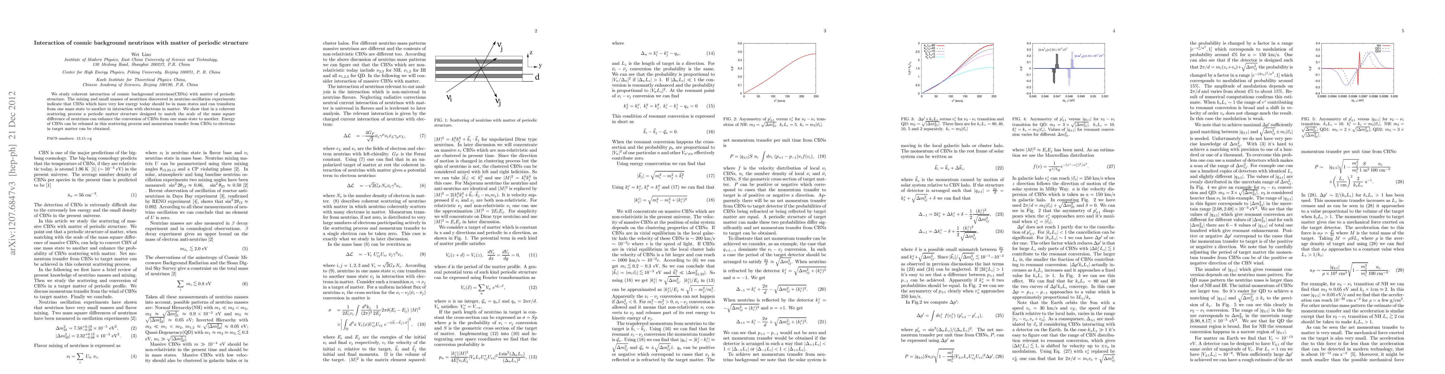 We study coherent interaction of cosmic background neutrinos(CBNs) with matter of periodic structure. The mixing and small masses of neutrinos discovered in neutrino oscillation experiments indicate that CBNs which have very low energy today should be in mass states and can transform from one mass state to another in interaction with electrons in matter. We show that in a coherent scattering process a periodic matter structure designed to match the scale of the mass square difference of neutrinos can enhance the conversion of CBNs from one mass state to another. Energy of CBNs can be released in this scattering process and momentum transfer from CBNs to electrons in target matter can be obtained.