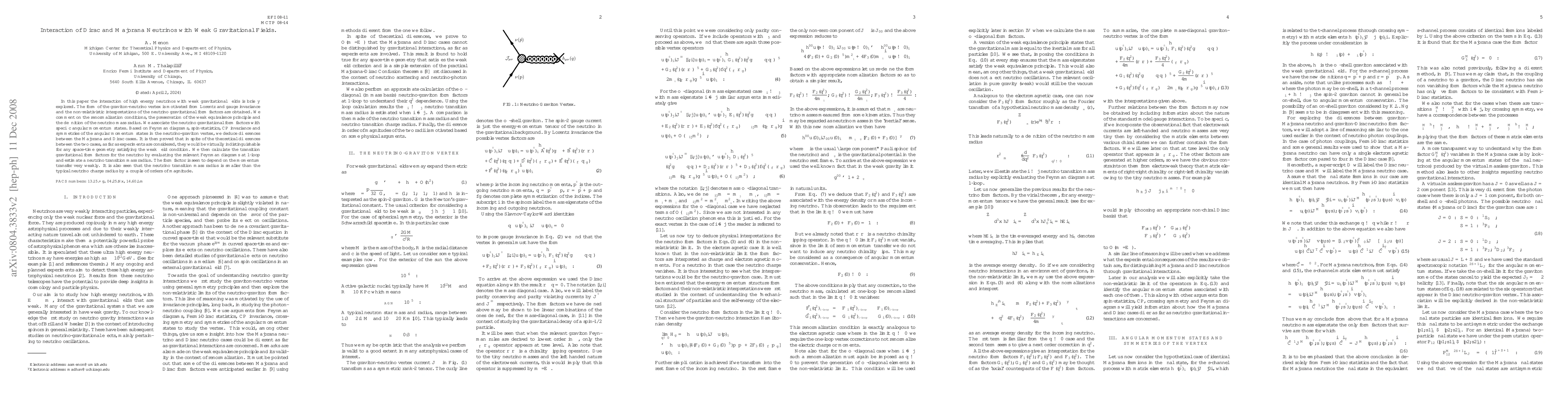 In this paper the interaction of high energy neutrinos with weak gravitational fields is briefly explored. The form of the graviton-neutrino vertex is motivated from Lorentz and gauge invariance and the non-relativistic interpretations of the neutrino gravitational form factors are obtained. We comment on the renormalization conditions, the preservation of the weak equivalence principle and the definition of the neutrino mass radius. We associate the neutrino gravitational form factors with specific angular momentum states. Based on Feynman diagrams, spin-statistics, CP invariance and symmetries of the angular momentum states in the neutrino-graviton vertex, we deduce differences between the Majorana and Dirac cases. It is then proved that in spite of the theoretical differences between the two cases, as far as experiments are considered, they would be virtually indistinguishable for any space-time geometry satisfying the weak field condition. We then calculate the transition gravitational form factors for the neutrino by evaluating the relevant Feynman diagrams at 1-loop and estimate a neutrino transition mass radius. The form factor is seen to depend on the momentum transfer very weakly. It is also seen that the neutrino transition mass radius is smaller than the typical neutrino charge radius by a couple of orders of magnitude.