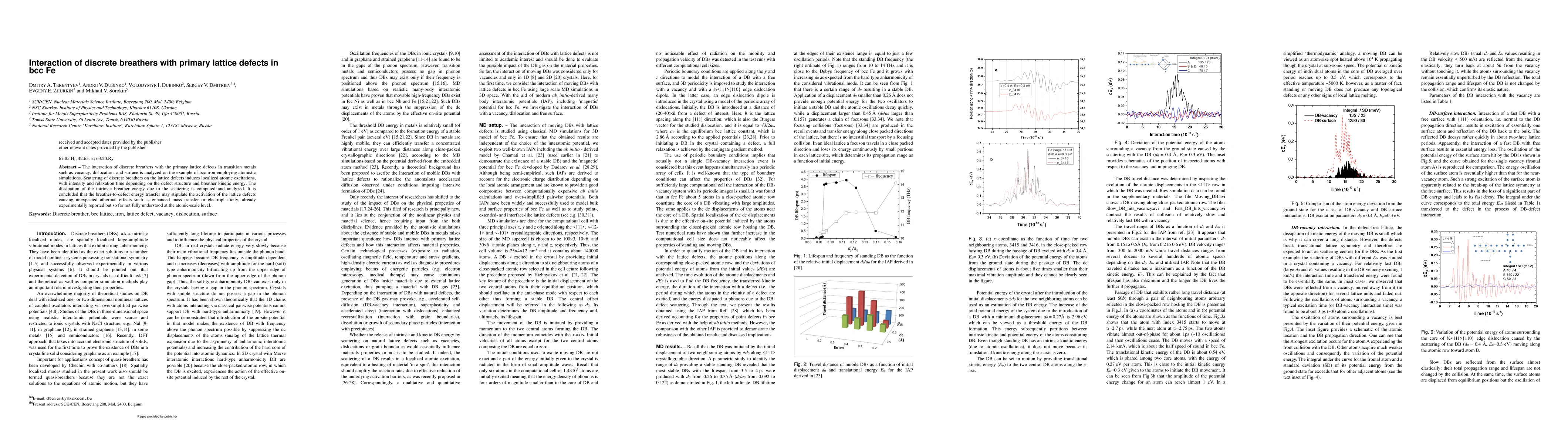 This paper investigates how discrete breathers interact with primary lattice defects in bcc iron using atomistic simulations. The study finds that scattering of discrete breathers on defects like vacancies and dislocations leads to localized atomic excitations, potentially causing unexpected athermal effects such as enhanced mass transfer or electroplasticity.