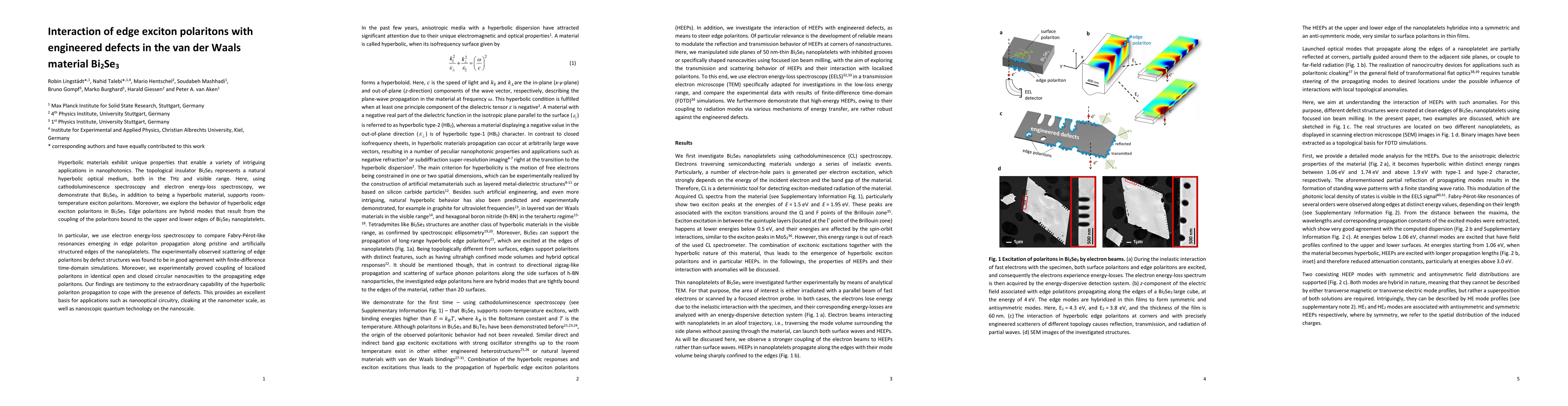 Hyperbolic materials exhibit unique properties that enable a variety of intriguing applications in nanophotonics. The topological insulator Bi2Se3 represents a natural hyperbolic optical medium, both in the THz and visible range. Here, using cathodoluminescence spectroscopy and electron energy-loss spectroscopy, we demonstrate that Bi2Se3, in addition to being a hyperbolic material, supports room-temperature exciton polaritons. Moreover, we explore the behavior of hyperbolic edge exciton polaritons in Bi2Se3. Edge polaritons are hybrid modes that result from the coupling of the polaritons bound to the upper and lower edges of Bi2Se3 nanoplatelets. In particular, we use electron energy-loss spectroscopy to compare Fabry-P\'erot-like resonances emerging in edge polariton propagation along pristine and artificially structured edges of the nanoplatelets. The experimentally observed scattering of edge polaritons by defect structures was found to be in good agreement with finite-difference time-domain simulations. Moreover, we experimentally proved coupling of localized polaritons in identical open and closed circular nanocavities to the propagating edge polaritons. Our findings are testimony to the extraordinary capability of the hyperbolic polariton propagation to cope with the presence of defects. This provides an excellent basis for applications such as nanooptical circuitry, cloaking at the nanometer scale, as well as nanoscopic quantum technology on the nanoscale.