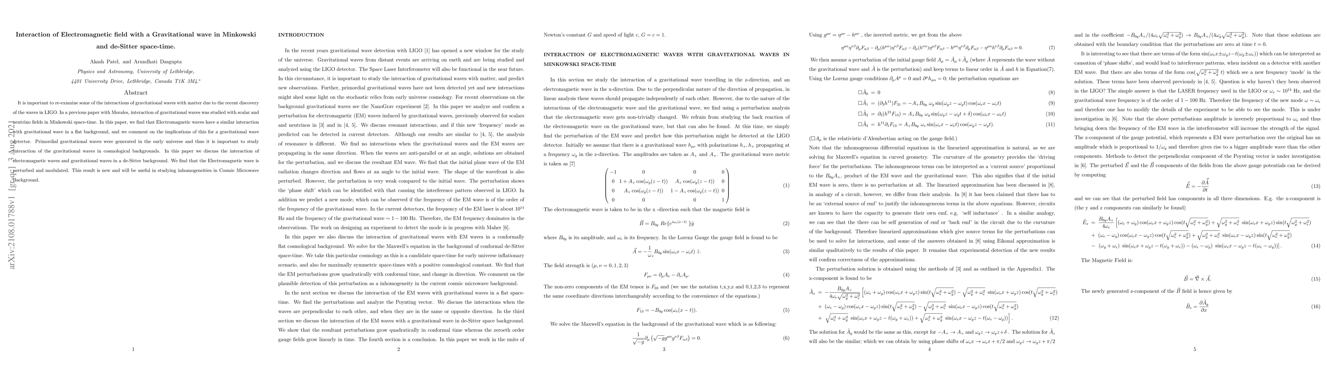This paper examines the interaction between electromagnetic and gravitational waves in both Minkowski and de-Sitter space-times, finding that electromagnetic waves are perturbed and modulated by gravitational waves, a result that has implications for gravitational wave detectors and the study of Cosmic Microwave Background inhomogeneities.