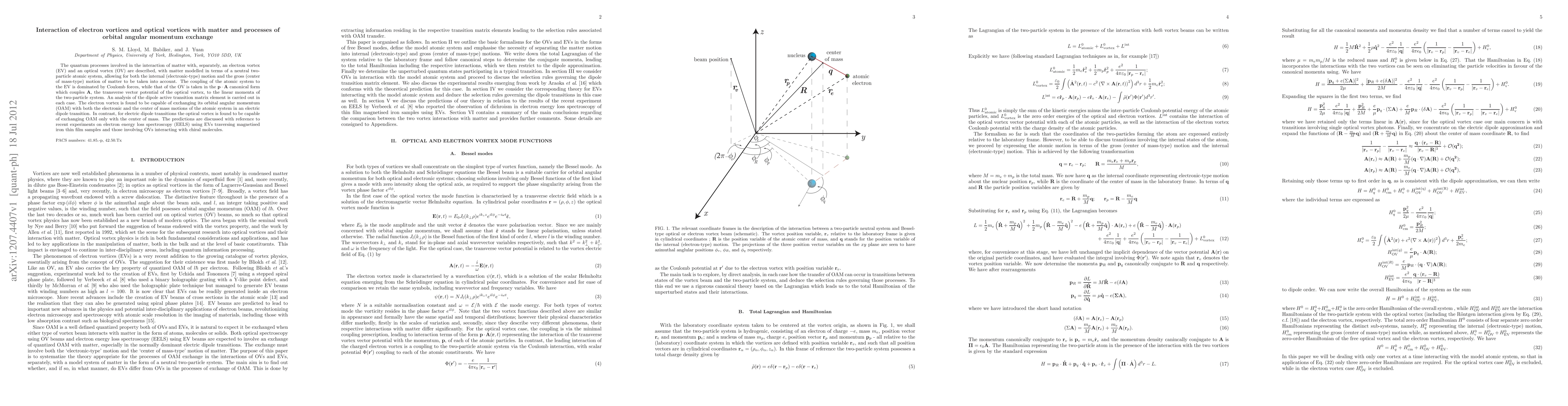 The quantum processes involved in the interaction of matter with, separately, an electron vortex(EV) and an optical vortex (OV) are described, with matter modelled in terms of a neutral two particle atomic system, allowing for both the internal (electronic-type) motion and the gross (center of mass-type) motion of matter to be taken into account. The coupling of the atomic system to the EV is dominated by Coulomb forces, while that of the OV is taken in the $\mathbf{p}\cdot\mathbf{A}$ canonical form which couples $\mathbf{A}$, the transverse vector potential of the optical vortex, to the linear momenta of the two-particle system. An analysis of the dipole active transition matrix element is carried out in each case. The electron vortex is found to be capable of exchanging its orbital angular momentum (OAM) with both the electronic and the center of mass motions of the atomic system in an electric dipole transition. In contrast, for electric dipole transitions the optical vortex is found to be capable of exchanging OAM only with the center of mass. The predictions are discussed with reference to recent experiments on electron energy loss spectroscopy (EELS) using EVs traversing magnetised iron thin film samples and those involving OVs interacting with chiral molecules.