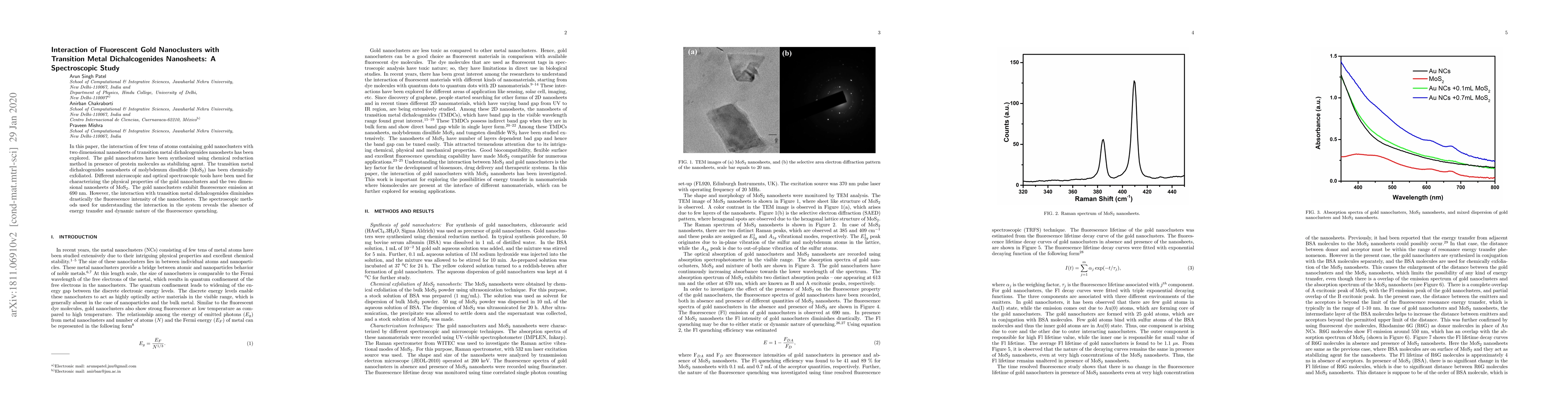 This paper investigates the interaction of fluorescent gold nanoclusters with molybdenum disulfide (MoS$_2$) nanosheets, showing that the fluorescence intensity of the gold nanoclusters diminishes upon interaction, with spectroscopic methods indicating no energy transfer and a dynamic quenching mechanism.