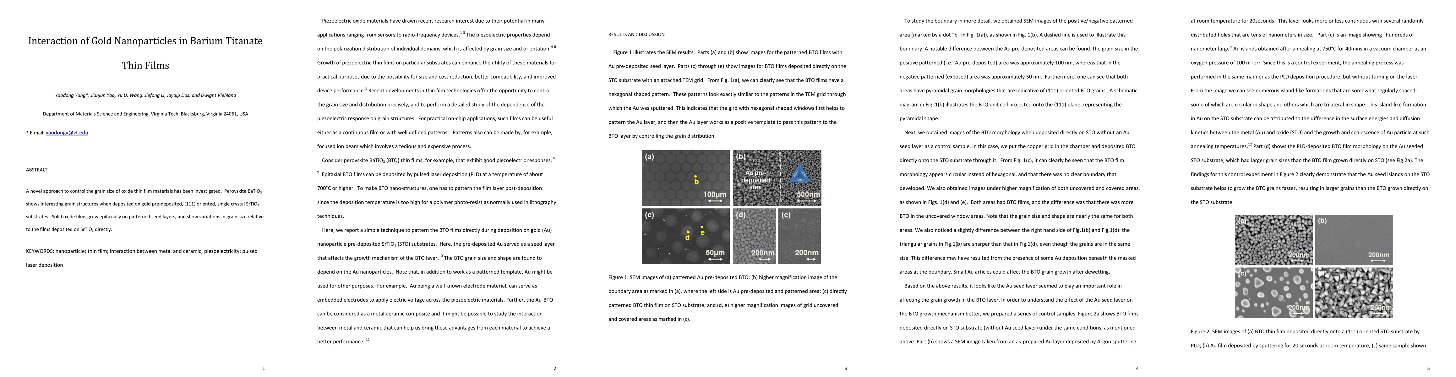 A novel approach to control the grain size of oxide thin film materials has been investigated. Perovskite BaTiO3 shows interesting grain structures when deposited on gold predeposited, (111)-oriented, singlecrystal SrTiO3 substrates. Solid oxide films grow epitaxially on patterned seed layers and show variations in grain size relative to the films deposited on SrTiO3 directly.