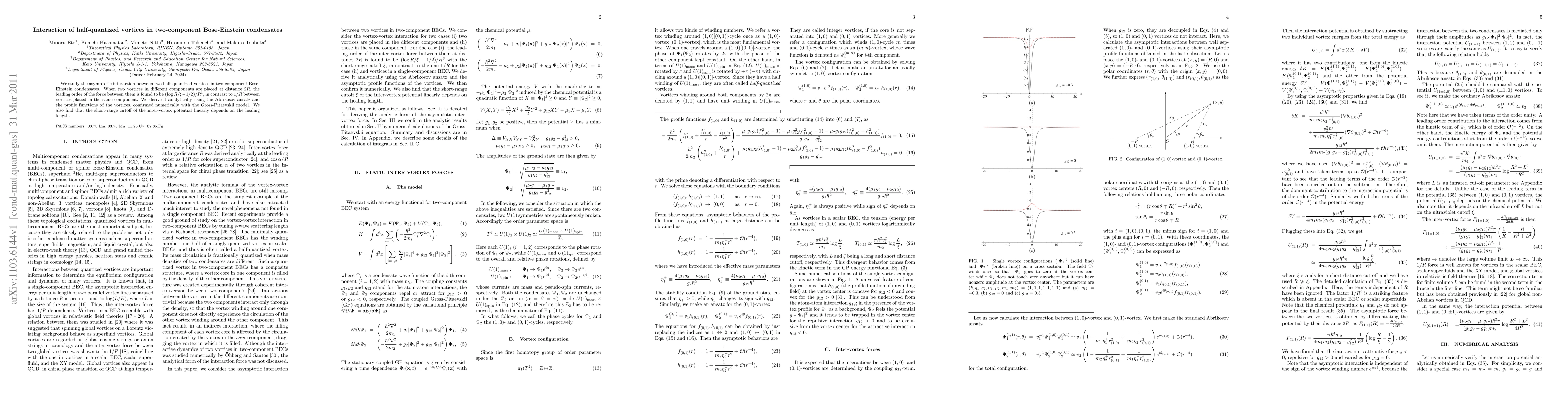 This paper investigates the interaction between two half-quantized vortices in two-component Bose-Einstein condensates, finding that the leading force between vortices in different components is (log R/\xi-1/2)/R^3 at distance 2R, differing from the 1/R interaction for same-component vortices. The analytical derivation uses the Abrikosov ansatz and is numerically validated with the Gross-Pitaevskii model.