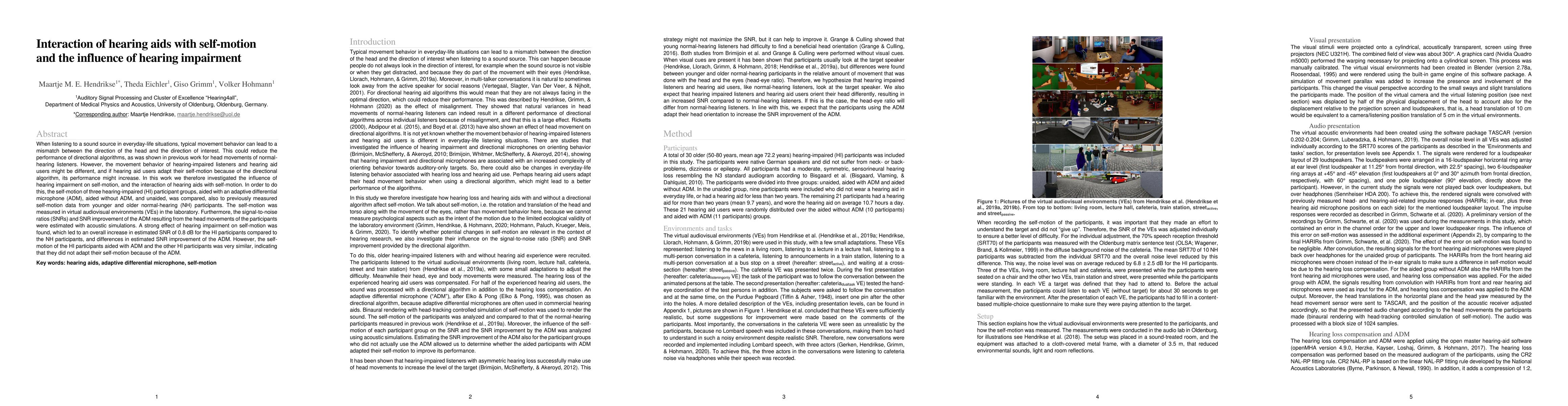 When listening to a sound source in everyday-life situations, typical movement behavior can lead to a mismatch between the direction of the head and the direction of interest. This could reduce the performance of directional algorithms, as was shown in previous work for head movements of normal-hearing listeners. However, the movement behavior of hearing-impaired listeners and hearing aid users might be different, and if hearing aid users adapt their self-motion because of the directional algorithm, its performance might increase. In this work we therefore investigated the influence of hearing impairment on self-motion, and the interaction of hearing aids with self-motion. In order to do this, the self-motion of three hearing-impaired (HI) participant groups, aided with an adaptive differential microphone (ADM), aided without ADM, and unaided, was compared, also to previously measured self-motion data from younger and older normal-hearing (NH) participants. The self-motion was measured in virtual audiovisual environments (VEs) in the laboratory. Furthermore, the signal-to-noise ratios (SNRs) and SNR improvement of the ADM resulting from the head movements of the participants were estimated with acoustic simulations. A strong effect of hearing impairment on self-motion was found, which led to an overall increase in estimated SNR of 0.8 dB for the HI participants compared to the NH participants, and differences in estimated SNR improvement of the ADM. However, the self-motion of the HI participants aided with ADM and the other HI participants was very similar, indicating that they did not adapt their self-motion because of the ADM.