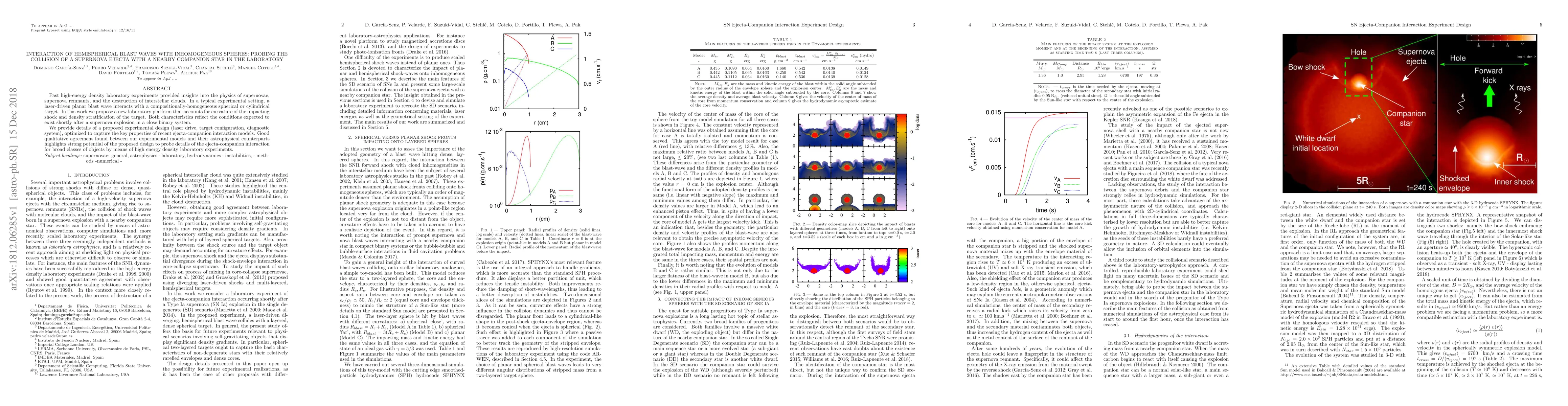 Past high-energy density laboratory experiments provided insights into the physics of supernovae, supernova remnants, and the destruction of interstellar clouds. In a typical experimental setting, a laser-driven planar blast wave interacts with a compositionally-homogeneous spherical or cylindrical target. In this work we propose a new laboratory platform that accounts for curvature of the impacting shock and density stratification of the target. Both characteristics reflect the conditions expected to exist shortly after a supernova explosion in a close binary system. We provide details of a proposed experimental design (laser drive, target configuration, diagnostic system), optimized to capture the key properties of recent ejecta-companion interaction models. Good qualitative agreement found between our experimental models and their astrophysical counterparts highlights strong potential of the proposed design to probe details of the ejecta-companion interaction for broad classes of objects by means of high energy density laboratory experiments.