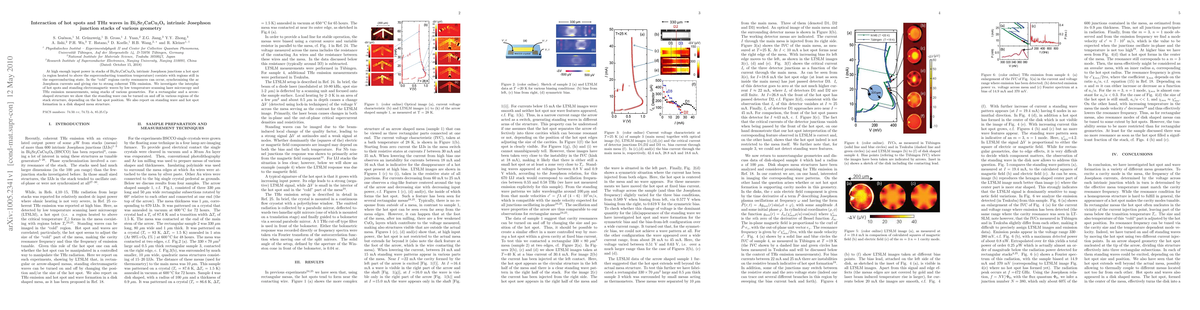 This paper investigates the interaction between hot spots and THz waves in Bi_2Sr_2CaCu_2O_8 intrinsic Josephson junction stacks of various geometries, revealing that hot spots can coexist with superconducting regions, leading to synchronized ac Josephson currents and coherent THz emission. The study demonstrates the control of standing electromagnetic waves in different stack geometries based on the position of hot spots.