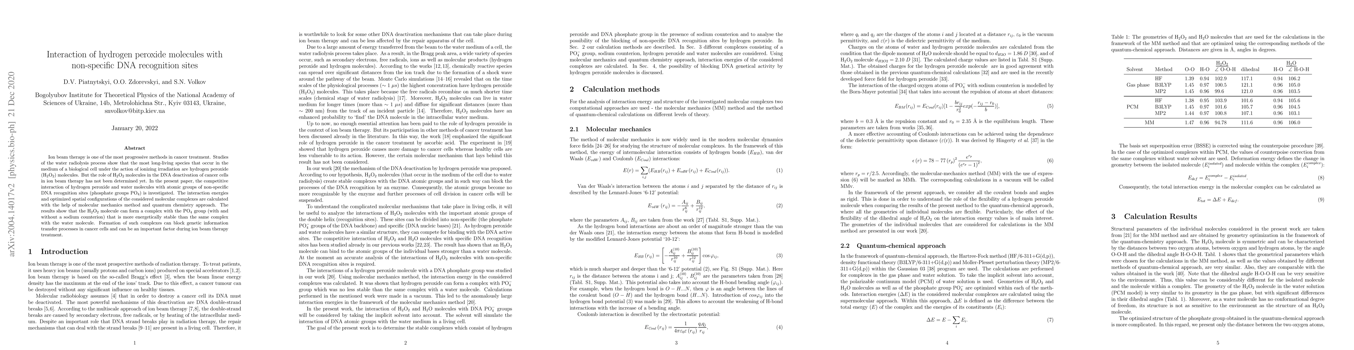 This paper investigates the interaction of hydrogen peroxide (H$_2$O$_2$) with non-specific DNA recognition sites, finding that H$_2$O$_2$ forms more stable complexes with phosphate groups than water, potentially blocking genetic information transfer in cancer cells during ion beam therapy.