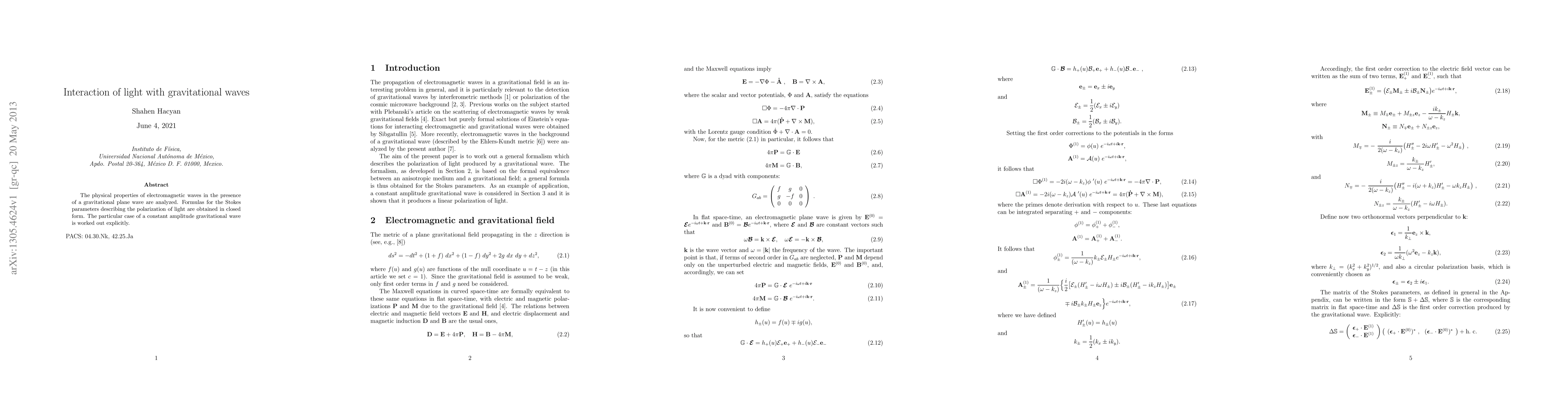 The physical properties of electromagnetic waves in the presence of a gravitational plane wave are analyzed. Formulas for the Stokes parameters describing the polarization of light are obtained in closed form. The particular case of a constant amplitude gravitational wave is worked out explicitly.
