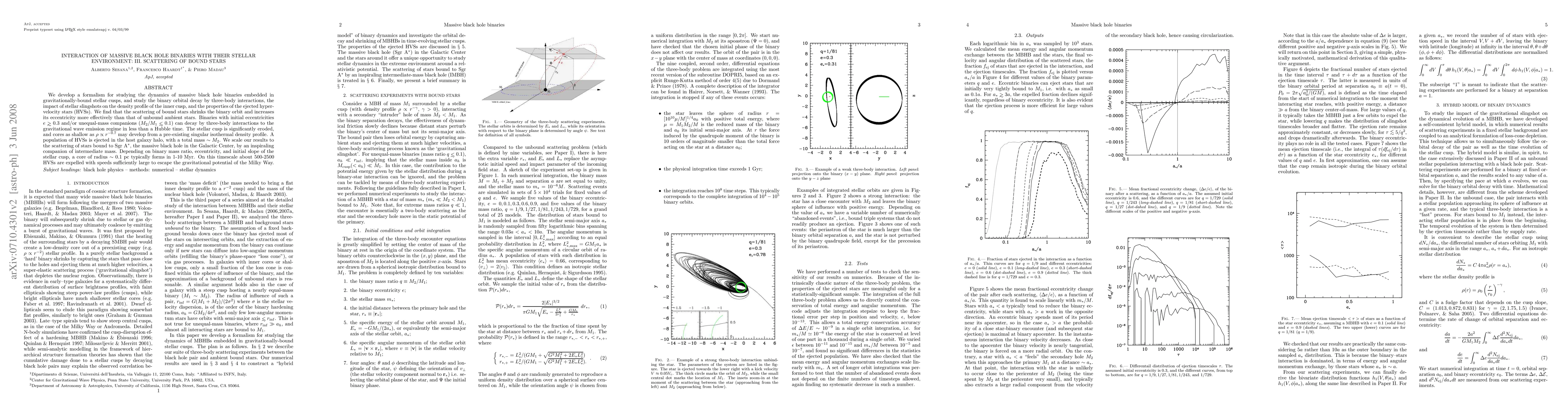 We develop a formalism for studying the dynamics of massive black hole binaries embedded in gravitationally-bound stellar cusps, and study the binary orbital decay by three-body interactions, the impact of stellar slingshots on the density profile of the inner cusp, and the properties of the ejected hypervelocity stars (HVSs). We find that the scattering of bound stars shrinks the binary orbit and increases its eccentricity more effectively than that of unbound ambient stars. Binaries with initial eccentricities e>0.3 and/or unequal-mass companions (M_2/M_1<0.1) can decay by three-body interactions to the gravitational wave emission regime in less than a Hubble time. The stellar cusp is significantly eroded, and cores as shallow as \rho\propto r^-0.7 may develop from a pre-existing singular isothermal density profile. A population of HVSs is ejected in the host galaxy halo, with a total mass ~M_2. We scale our results to the scattering of stars bound to Sgr A*, the massive black hole in the Galactic Center, by an inspiraling companion of intermediate mass. Depending on binary mass ratio, eccentricity, and initial slope of the stellar cusp, a core of radius ~0.1 pc typically forms in 1-10 Myr. On this timescale about 500-2500 HVSs are expelled with speeds sufficiently large to escape the gravitational potential of the Milky Way.