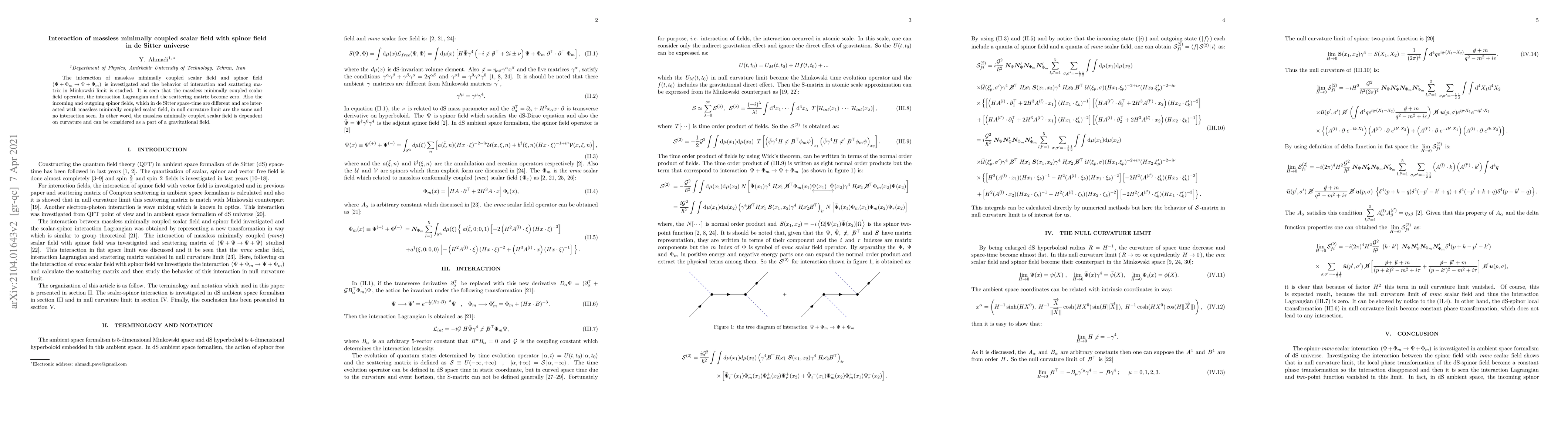This research investigates the interaction between a massless minimally coupled scalar field and a spinor field in a de Sitter universe, finding no interaction in the Minkowski limit. The massless scalar field's dependence on curvature suggests it functions as part of a gravitational field.