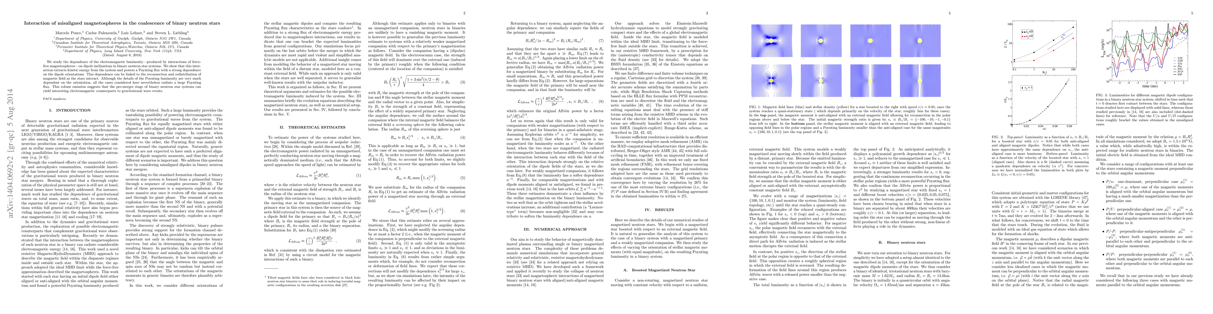 This study investigates how misaligned magnetospheres in coalescing binary neutron stars generate electromagnetic luminosity through magnetic interactions, showing that dipole inclination angles strongly influence the resulting Poynting flux and kinetic energy extraction, highlighting the potential for significant electromagnetic counterparts to gravitational wave events.