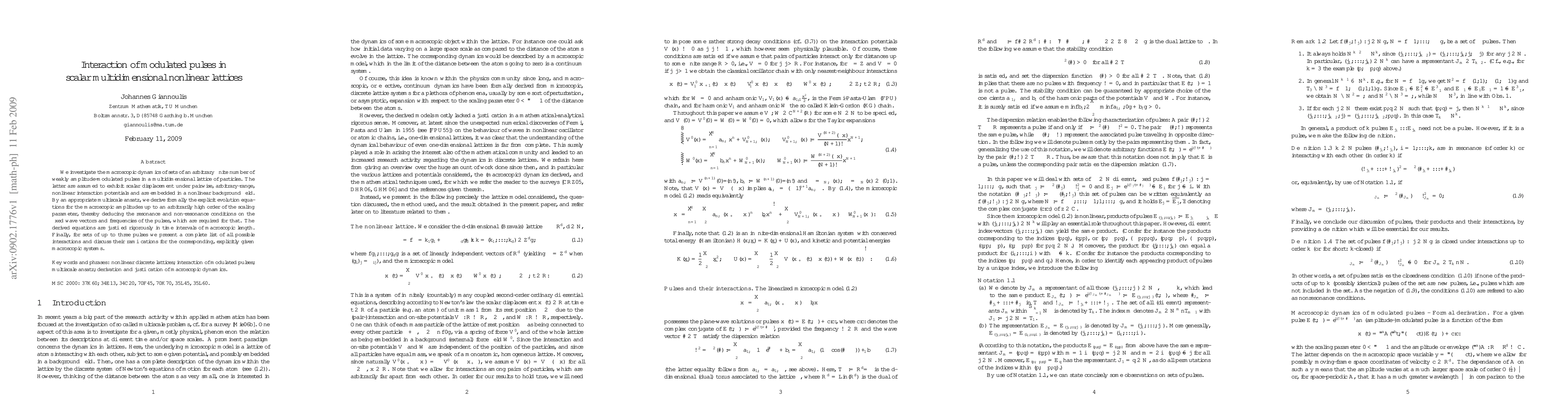 We investigate the macroscopic dynamics of sets of an arbitrary finite number of weakly amplitude-modulated pulses in a multidimensional lattice of particles. The latter are assumed to exhibit scalar displacement under pairwise, arbitrary-range, nonlinear interaction potentials and are embedded in a nonlinear background field. By an appropriate multiscale ansatz, we derive formally the explicit evolution equations for the macroscopic amplitudes up to an arbitrarily high order of the scaling parameter, thereby deducing the resonance and non-resonance conditions on the fixed wave vectors and frequencies of the pulses, which are required for that. The derived equations are justified rigorously in time intervals of macroscopic length. Finally, for sets up to three pulses we present a complete list of all possible interactions and discuss their ramifications for the corresponding, explicitly given macroscopic systems.