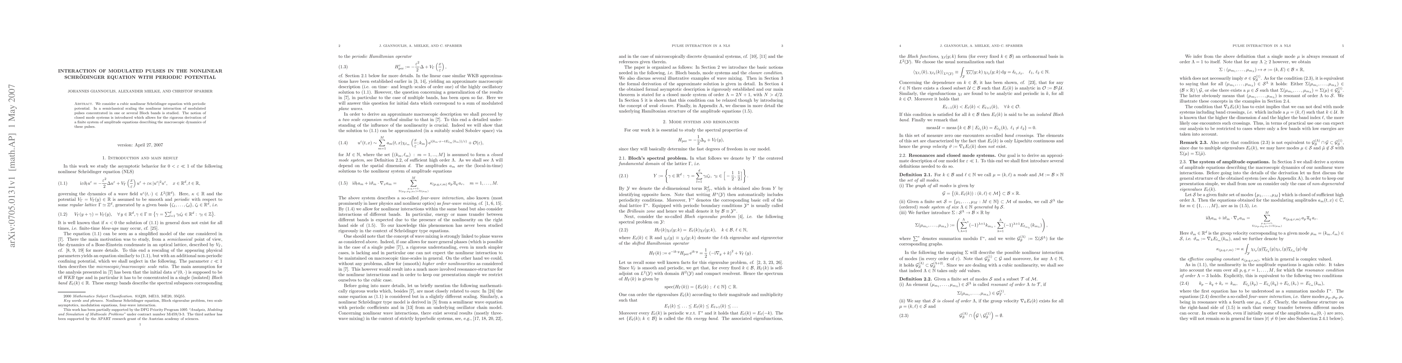 This paper investigates the nonlinear interaction of modulated pulses in a cubic nonlinear Schrödinger equation with a periodic potential, deriving a finite set of amplitude equations that describe the macroscopic dynamics of these pulses using the concept of closed mode systems.