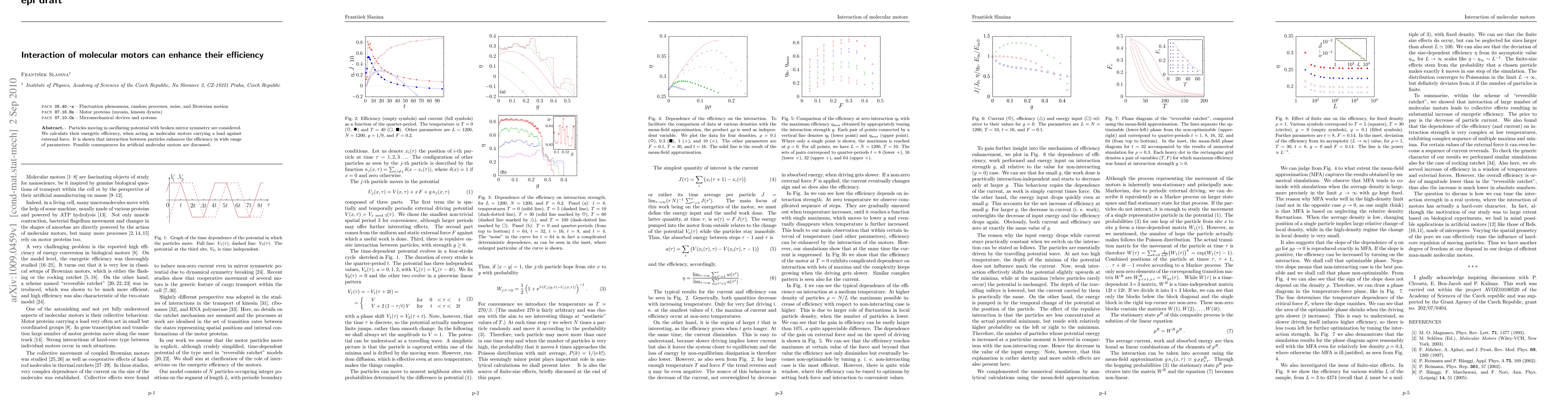 Particles moving in oscillating potential with broken mirror symmetry are considered. We calculate their energetic efficiency, when acting as molecular motors carrying a load against external force. It is shown that interaction between particles enhances the efficiency in wide range of parameters. Possible consequences for artificial molecular motors are discussed.