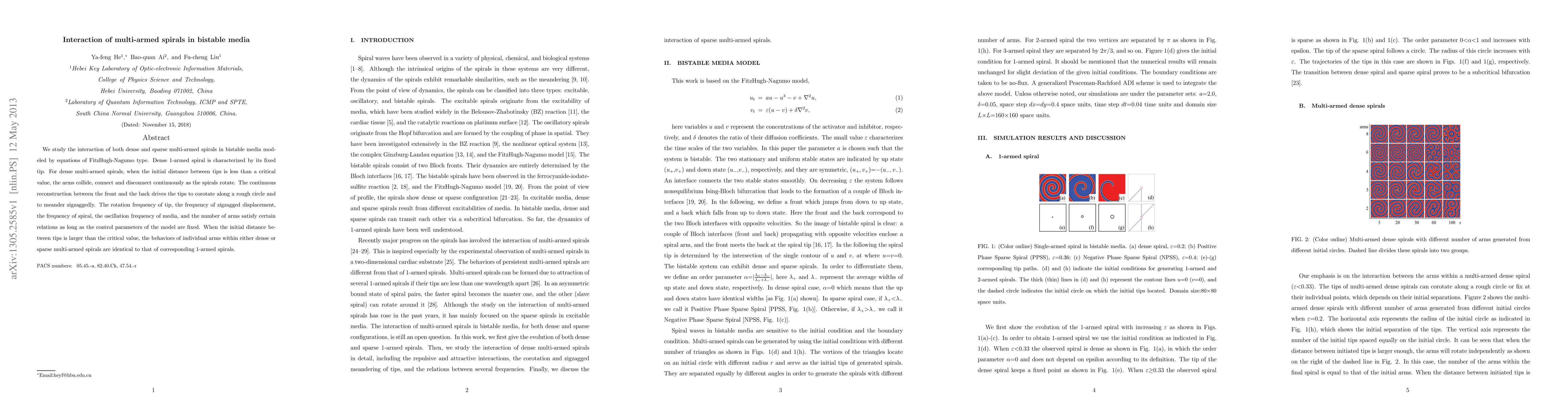 We study the interaction of both dense and sparse multi-armed spirals in bistable media modeled by equations of FitzHugh-Nagumo type. Dense 1-armed spiral is characterized by its fixed tip. For dense multi-armed spirals, when the initial distance between tips is less than a critical value, the arms collide, connect and disconnect continuously as the spirals rotate. The continuous reconstruction between the front and the back drives the tips to corotate along a rough circle and to meander zigzaggedly. The rotation frequency of tip, the frequency of zigzagged displacement, the frequency of spiral, the oscillation frequency of media, and the number of arms satisfy certain relations as long as the control parameters of the model are fixed. When the initial distance between tips is larger than the critical value, the behaviors of individual arms within either dense or sparse multi-armed spirals are identical to that of corresponding 1-armed spirals.