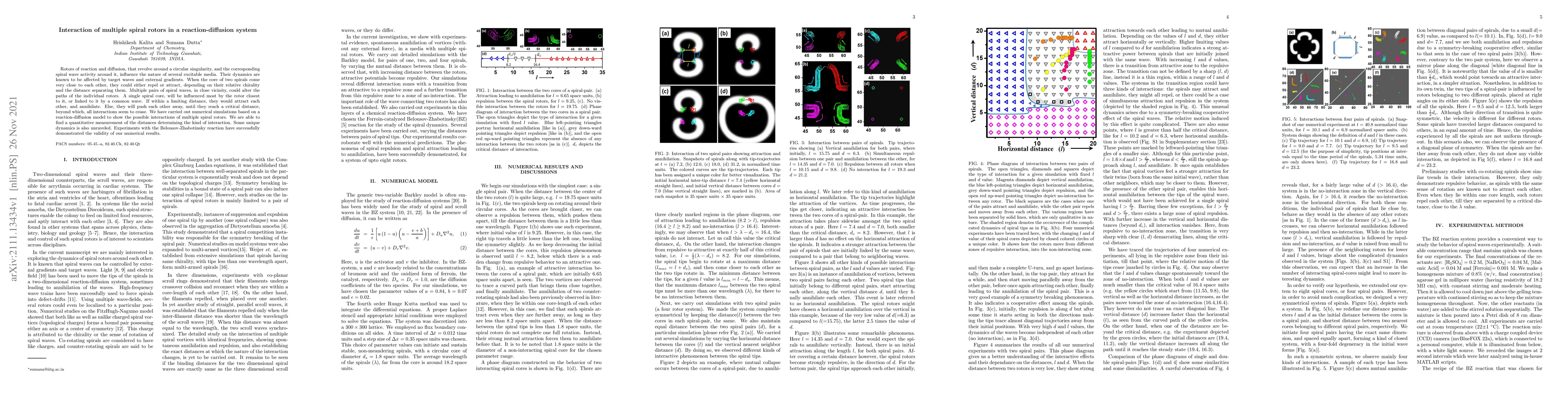 This paper investigates the interactions between multiple spiral rotors in a reaction-diffusion system, revealing how their relative chirality and proximity determine whether they repel, attract, or annihilate. Numerical simulations and experiments with the Belousov-Zhabotinsky reaction validate the model's predictions of these dynamic behaviors.