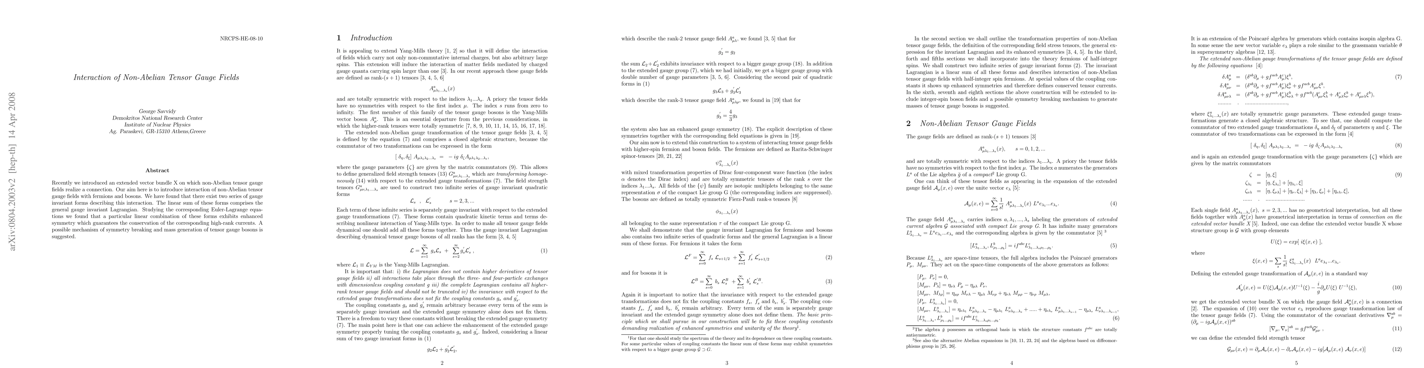 This research explores the interaction of non-Abelian tensor gauge fields with fermions and bosons on an extended vector bundle, revealing two series of gauge invariant forms that form the general Lagrangian. Enhanced symmetry within a specific linear combination of these forms ensures the conservation of high-rank currents, while a potential mechanism for symmetry breaking and mass generation for tensor gauge bosons is proposed.