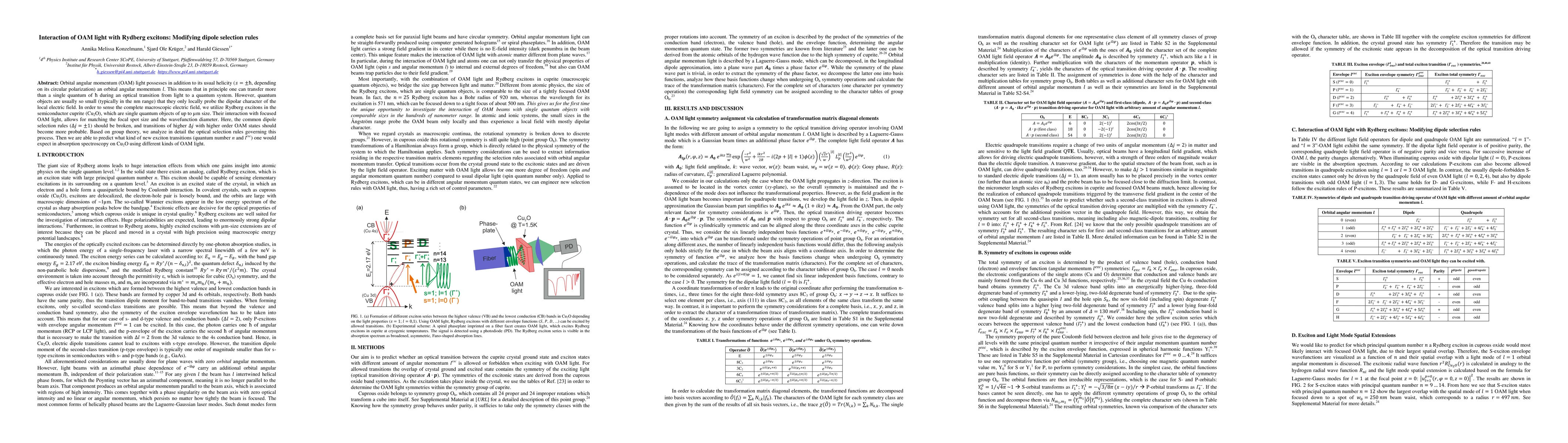 The paper presents a comprehensive group-theoretical analysis of OAM light-exciton interactions, proposing a novel approach to excite dipole-forbidden Rydberg excitons in Cu2O using OAM light.