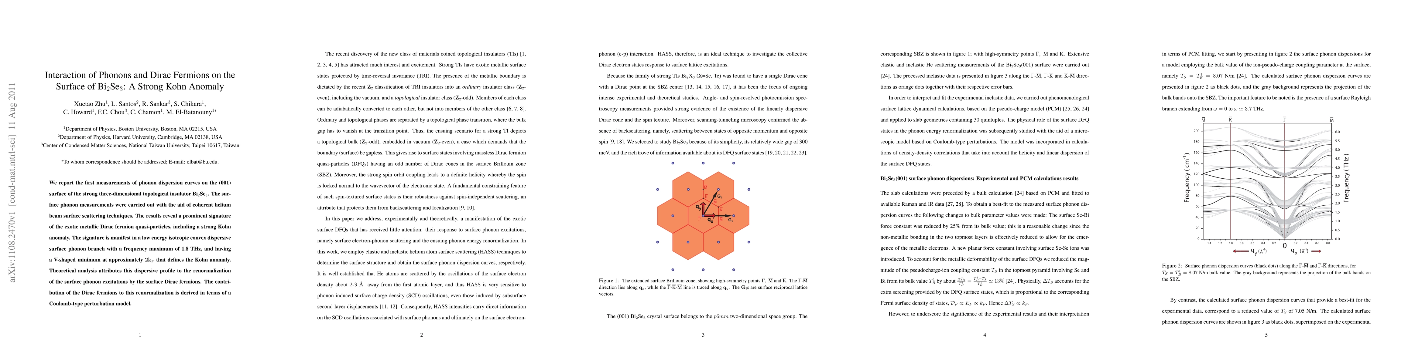 We report the first measurements of phonon dispersion curves on the (001) surface of the strong three-dimensional topological insulator Bi2Se3. The surface phonon measurements were carried out with the aid of coherent helium beam surface scattering techniques. The results reveal a prominent signature of the exotic metallic Dirac fermion quasi-particles, including a strong Kohn anomaly. The signature is manifest in a low energy isotropic convex dispersive surface phonon branch with a frequency maximum of 1.8 THz, and having a V-shaped minimum at approximately 2kF that defines the Kohn anomaly. Theoretical analysis attributes this dispersive profile to the renormalization of the surface phonon excitations by the surface Dirac fermions. The contribution of the Dirac fermions to this renormalization is derived in terms of a Coulomb-type perturbation model.