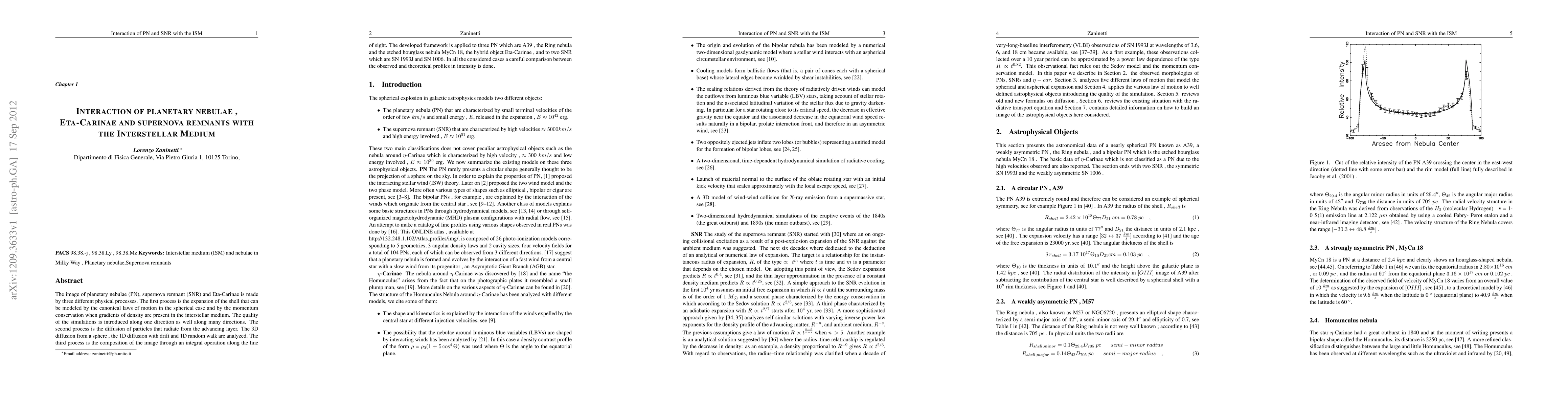 This paper investigates the interaction of planetary nebulae, supernova remnants, and Eta-Carinae with the interstellar medium through three processes: shell expansion, particle diffusion, and image composition. Simulations and theoretical profiles are compared to observed data for various objects.