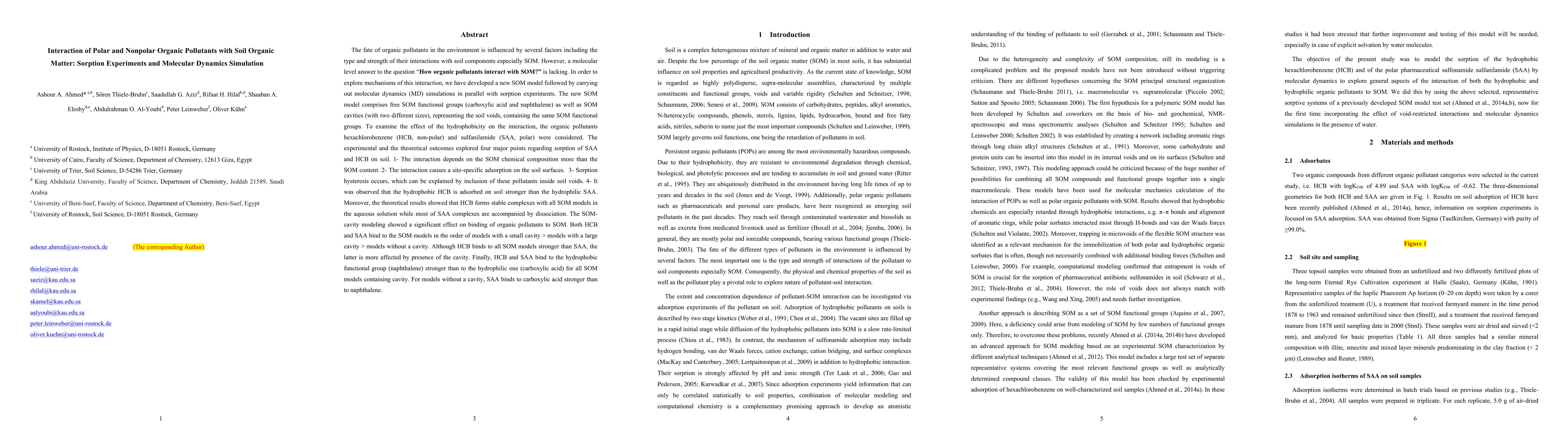 This study investigates the interaction between polar and nonpolar organic pollutants and soil organic matter (SOM) using molecular dynamics simulations and sorption experiments. Findings indicate that the interaction's strength depends more on SOM's chemical composition than its content, and that hydrophobic pollutants like hexachlorobenzene exhibit stronger adsorption compared to polar ones like sulfanilamide.