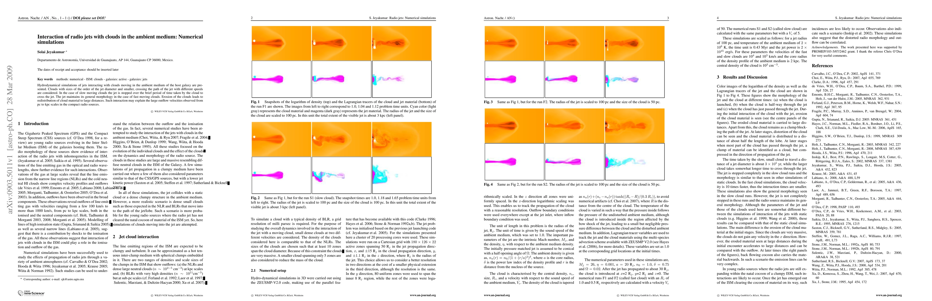 Hydrodynamical simulations of jets interacting with clouds moving in the ambient medium of the host galaxy are presented. Clouds with sizes of the order of the jet diameter and smaller, crossing the path of the jet with different speeds are considered. In the case of slow moving clouds the jet is stopped over the brief period of time taken by the cloud to cross the jet. The jet maintains its general morphology in the case of fast moving clouds. Erosion of the clouds leads to redistribution of cloud material to large distances. Such interaction may explain the large outflow velocities observed from pc to kpc scales in the compact radio sources.
