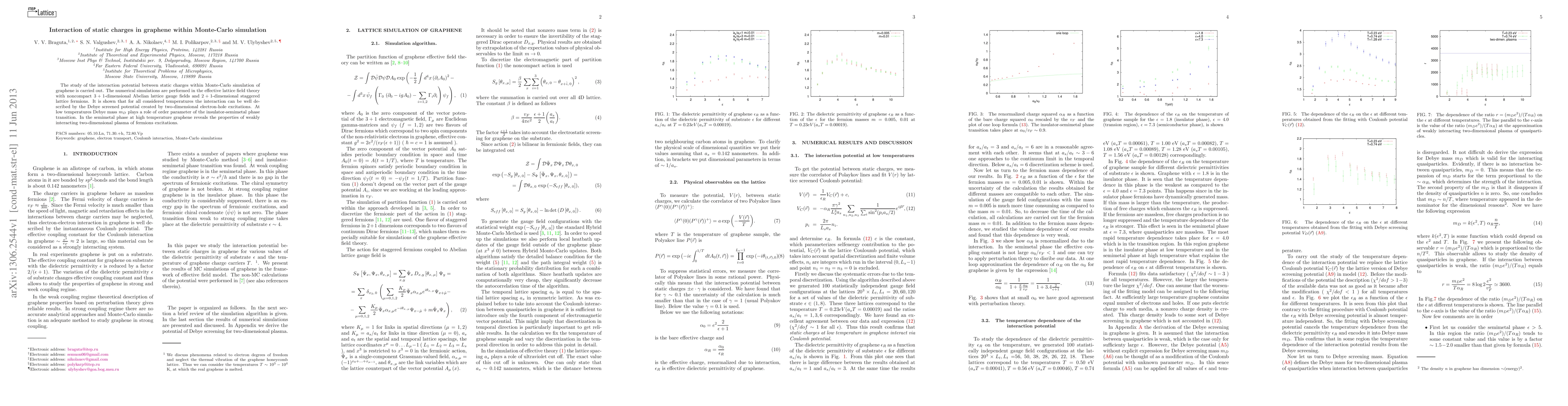 This study uses Monte-Carlo simulations to explore the interaction potential between static charges in graphene, demonstrating that the interaction is well described by a Debye screened potential. At low temperatures, the Debye mass signifies the insulator-semimetal phase transition, while high temperatures reveal graphene as a weakly interacting two-dimensional plasma.