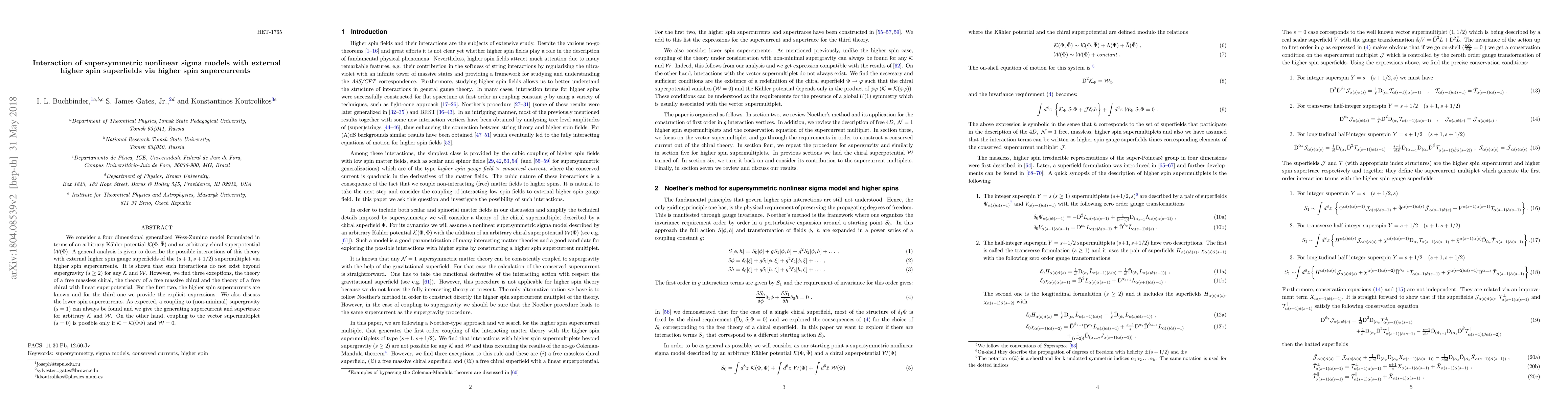 We consider a four dimensional generalized Wess-Zumino model formulated in terms of an arbitrary K\"{a}hler potential $\mathcal{K}(\Phi,\bar{\Phi})$ and an arbitrary chiral superpotential $\mathcal{W}(\Phi)$. A general analysis is given to describe the possible interactions of this theory with external higher spin gauge superfields of the ($s+1,s+1/2$) supermultiplet via higher spin supercurrents. It is shown that such interactions do not exist beyond supergravity $(s\geq2)$ for any $\mathcal{K}$ and $\mathcal{W}$. However, we find three exceptions, the theory of a free massless chiral, the theory of a free massive chiral and the theory of a free chiral with linear superpotential. For the first two, the higher spin supercurrents are known and for the third one we provide the explicit expressions. We also discuss the lower spin supercurrents. As expected, a coupling to (non-minimal) supergravity ($s=1$) can always be found and we give the generating supercurrent and supertrace for arbitrary $\mathcal{K}$ and $\mathcal{W}$. On the other hand, coupling to the vector supermultiplet ($s=0$) is possible only if $\mathcal{K}=\mathcal{K}(\bar{\Phi}\Phi)$ and $\mathcal{W}=0$.