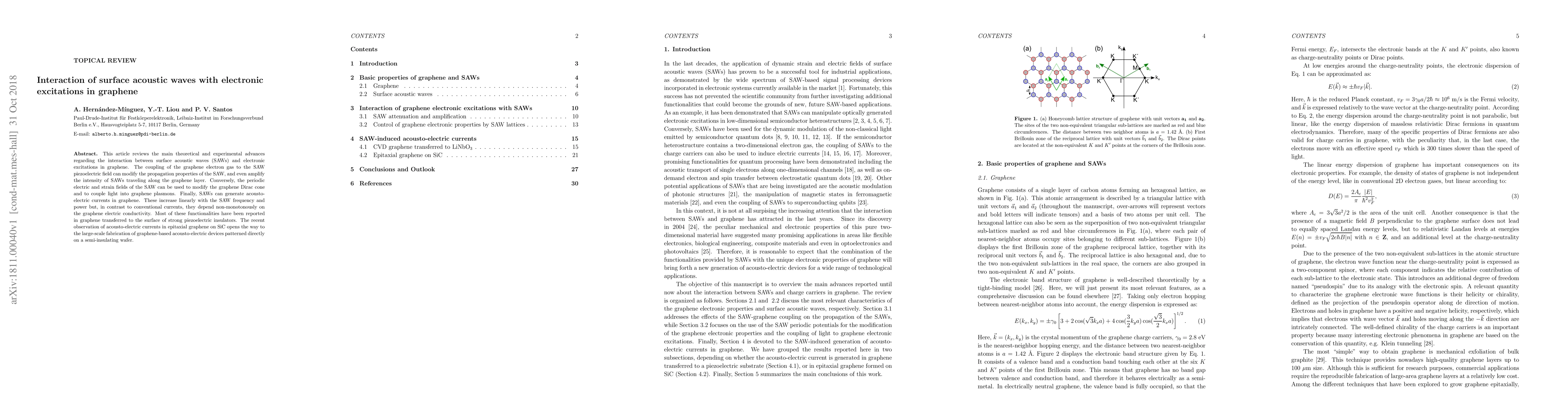 This paper reviews advances in the interaction between surface acoustic waves (SAWs) and electronic excitations in graphene, highlighting how SAWs can modify SAW propagation and generate acousto-electric currents, with potential applications in graphene-based devices.
