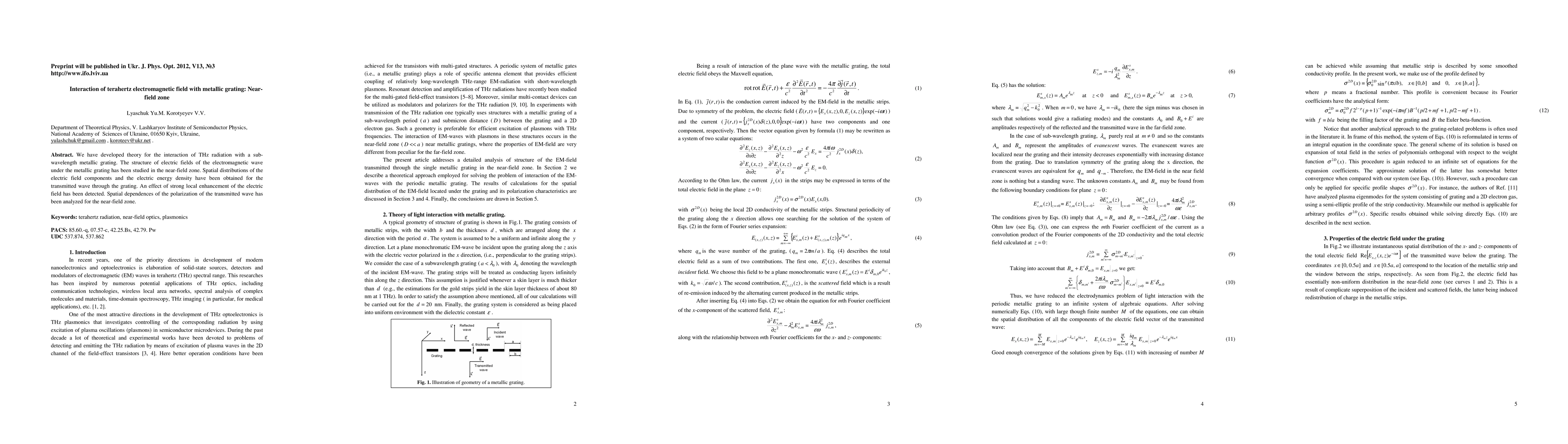 This paper develops a theoretical framework for the interaction of terahertz (THz) radiation with sub-wavelength metallic gratings, focusing on the near-field zone. It reveals significant local enhancements in the electric field and analyzes the spatial distribution and polarization of the transmitted wave.