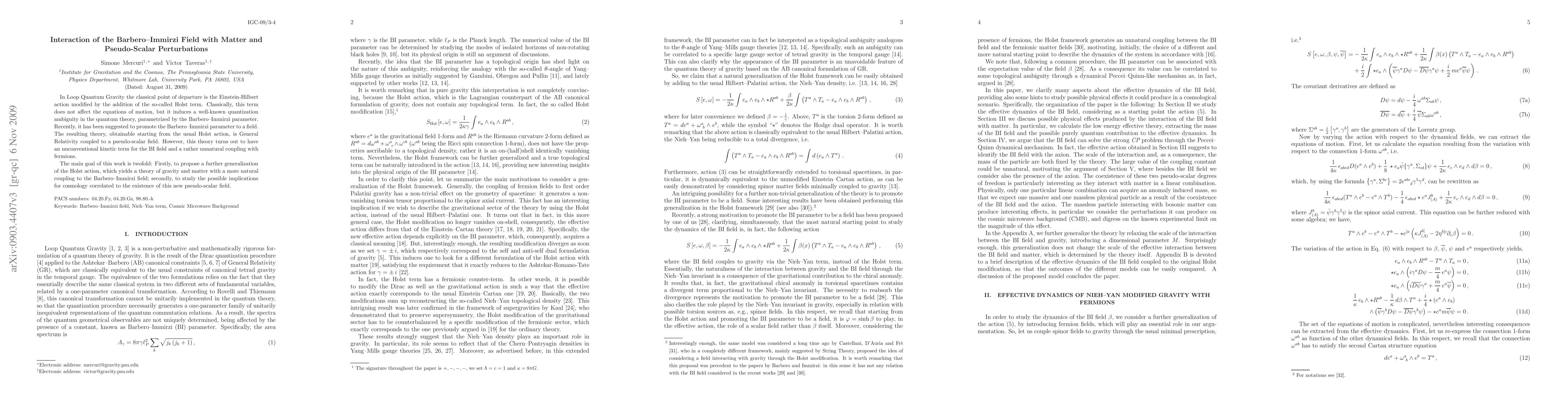 This paper proposes a generalized Holst action to create a theory of gravity and matter with a more natural coupling to the Barbero--Immirzi field, and explores the cosmological implications of this new pseudo-scalar field.