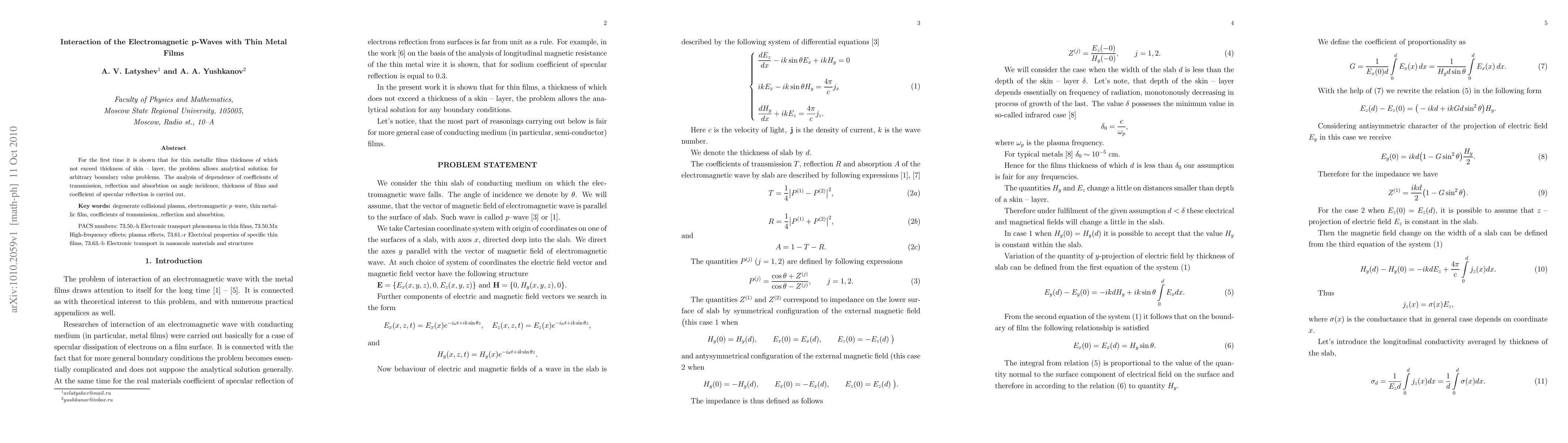 This paper presents the first analytical solution for electromagnetic p-waves interacting with thin metal films, where the film thickness does not exceed the skin-layer. The study analyzes the transmission, reflection, and absorption coefficients in relation to the angle of incidence, film thickness, and specular reflection coefficient.