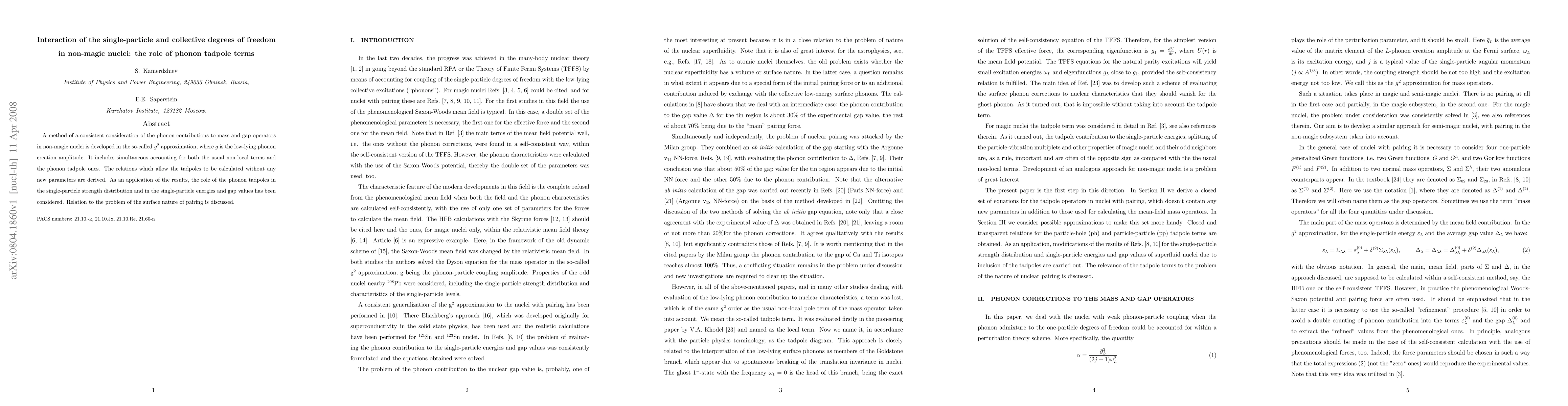 A method of a consistent consideration of the phonon contributions to mass and gap operators in non-magic nuclei is developed in the so-called g^2 approximation, where g is the low-lying phonon creation amplitude. It includes simultaneous accounting for both the usual non-local terms and the phonon tadpole ones. The relations which allow the tadpoles to be calculated without any new parameters are derived. As an application of the results, the role of the phonon tadpoles in the single-particle strength distribution and in the single-particle energies and gap values has been considered. Relation to the problem of the surface nature of pairing is discussed.