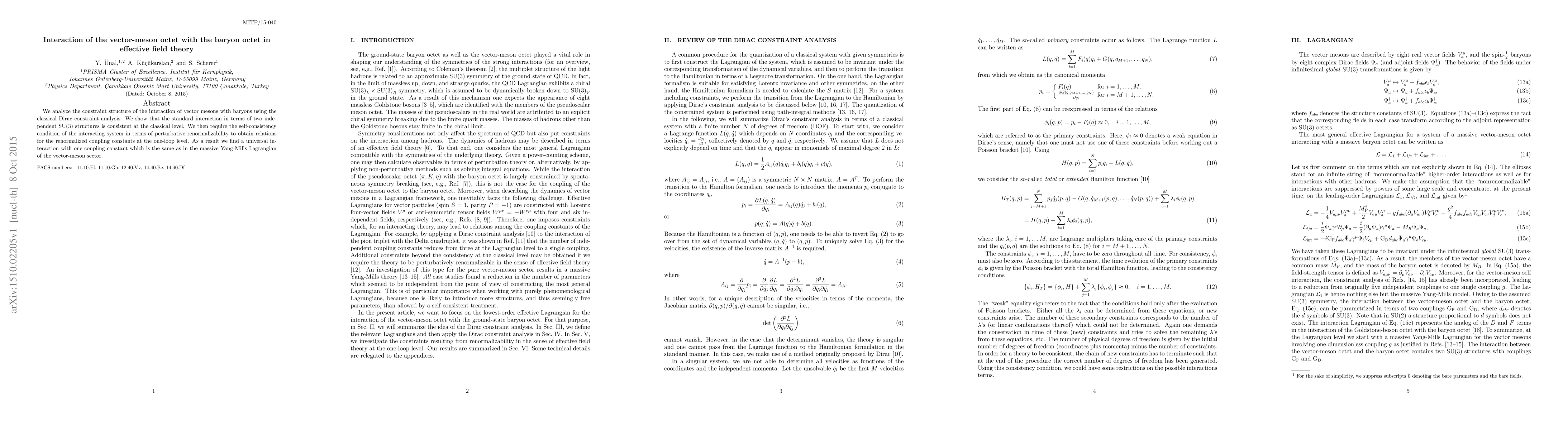 We analyze the constraint structure of the interaction of vector mesons with baryons using the classical Dirac constraint analysis. We show that the standard interaction in terms of two independent SU(3) structures is consistent at the classical level. We then require the self-consistency condition of the interacting system in terms of perturbative renormalizability to obtain relations for the renormalized coupling constants at the one-loop level. As a result we find a universal interaction with one coupling constant which is the same as in the massive Yang-Mills Lagrangian of the vector-meson sector.