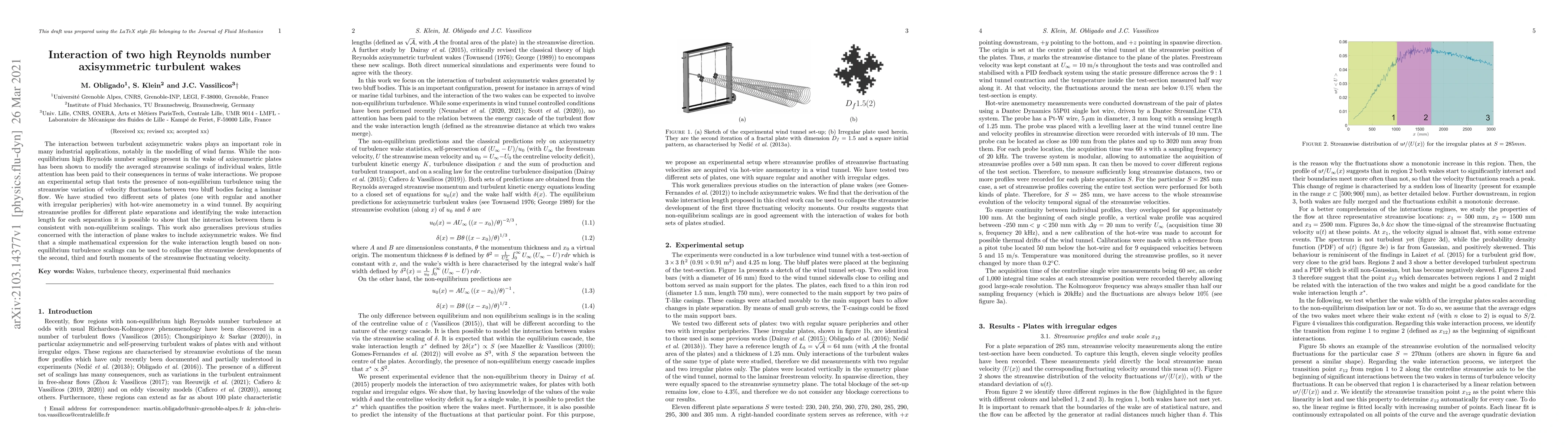 The interaction between turbulent axisymmetric wakes plays an important role in many industrial applications, notably in the modelling of wind farms. While the non-equilibrium high Reynolds number scalings present in the wake of axisymmetric plates has been shown to modify the averaged streamwise scalings of individual wakes, little attention has been paid to their consequences in terms of wake interactions. We propose an experimental setup that tests the presence of non-equilibrium turbulence using the streamwise variation of velocity fluctuations between two bluff bodies facing a laminar flow. We have studied two different sets of plates (one with regular and another with irregular peripheries) with hot-wire anemometry in a wind tunnel. By acquiring streamwise profiles for different plate separations and identifying the wake interaction length for each separation it is possible to show that the interaction between them is consistent with non-equilibrium scalings. This work also generalises previous studies concerned with the interaction of plane wakes to include axisymmetric wakes. We find that a simple mathematical expression for the wake interaction length based on non-equilibrium turbulence scalings can be used to collapse the streamwise developments of the second, third and fourth moments of the streamwise fluctuating velocity.