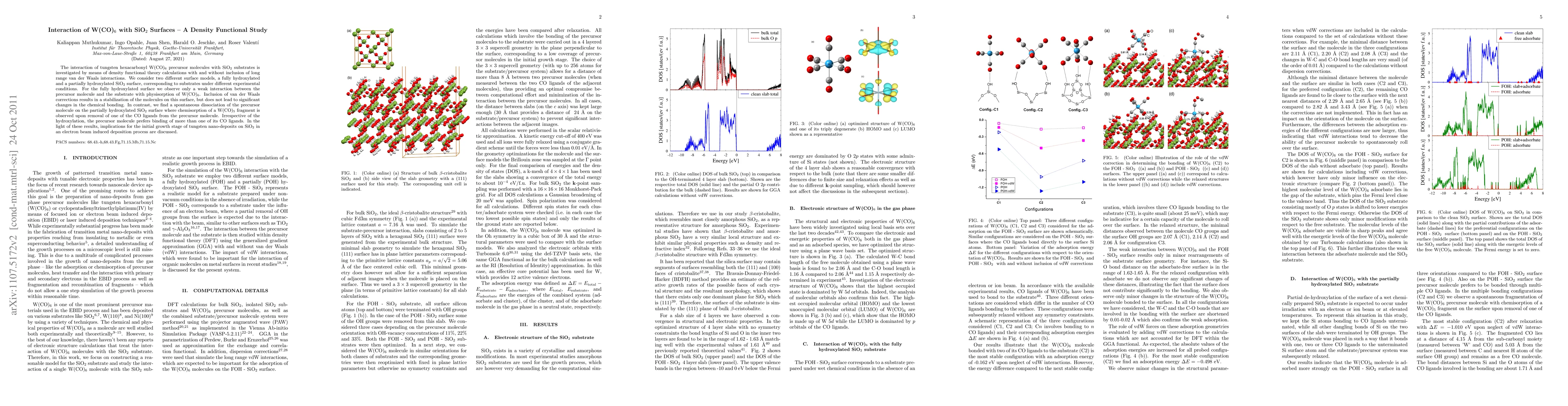 The interaction of tungsten hexacarbonyl W(CO)$_6$ precursor molecules with SiO$_2$ substrates is investigated by means of density functional theory calculations with and without inclusion of long range van der Waals interactions. We consider two different surface models, a fully hydroxylated and a partially hydroxylated SiO$_2$ surface, corresponding to substrates under different experimental conditions. For the fully hydroxylated surface we observe only a weak interaction between the precursor molecule and the substrate with physisorption of W(CO)$_6$. Inclusion of van der Waals corrections results in a stabilization of the molecules on this surface, but does not lead to significant changes in the chemical bonding. In contrast, we find a spontaneous dissociation of the precursor molecule on the partially hydroxylated SiO$_2$ surface where chemisorption of a W(CO)$_5$ fragment is observed upon removal of one of the CO ligands from the precursor molecule. Irrespective of the hydroxylation, the precursor molecule prefers binding of more than one of its CO ligands. In the light of these results, implications for the initial growth stage of tungsten nano-deposits on SiO$_2$ in an electron beam induced deposition process are discussed.