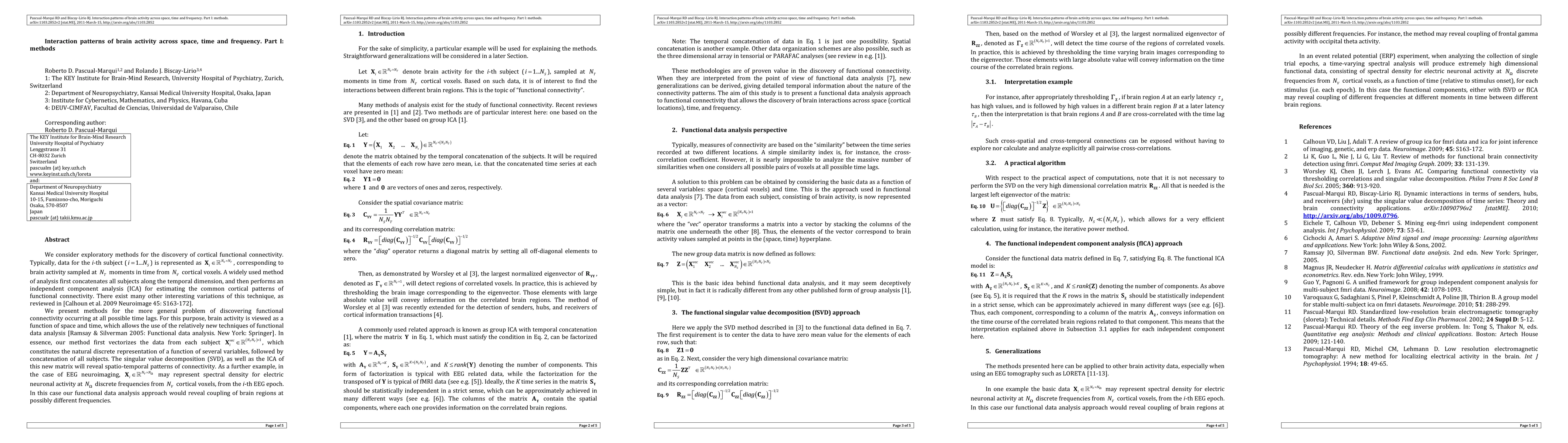 We consider exploratory methods for the discovery of cortical functional connectivity. Typically, data for the i-th subject (i=1...NS) is represented as an NVxNT matrix Xi, corresponding to brain activity sampled at NT moments in time from NV cortical voxels. A widely used method of analysis first concatenates all subjects along the temporal dimension, and then performs an independent component analysis (ICA) for estimating the common cortical patterns of functional connectivity. There exist many other interesting variations of this technique, as reviewed in [Calhoun et al. 2009 Neuroimage 45: S163-172]. We present methods for the more general problem of discovering functional connectivity occurring at all possible time lags. For this purpose, brain activity is viewed as a function of space and time, which allows the use of the relatively new techniques of functional data analysis [Ramsay & Silverman 2005: Functional data analysis. New York: Springer]. In essence, our method first vectorizes the data from each subject, which constitutes the natural discrete representation of a function of several variables, followed by concatenation of all subjects. The singular value decomposition (SVD), as well as the ICA of this new matrix of dimension [rows=(NT*NV); columns=NS] will reveal spatio-temporal patterns of connectivity. As a further example, in the case of EEG neuroimaging, Xi of size NVxNW may represent spectral density for electric neuronal activity at NW discrete frequencies from NV cortical voxels, from the i-th EEG epoch. In this case our functional data analysis approach would reveal coupling of brain regions at possibly different frequencies.